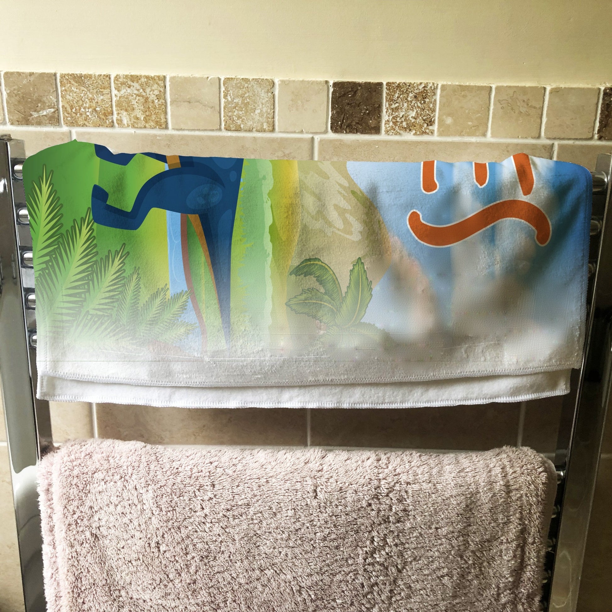 Fantastic colourful dinosaur design. Bright white microfibre towel made from a polyester and cotton mix fabric, it absorbs so much better then most polyester towels sold today! Fantastic for the bathroom, gym or when you're sunning it up on the beach! Towel is printed with your name.