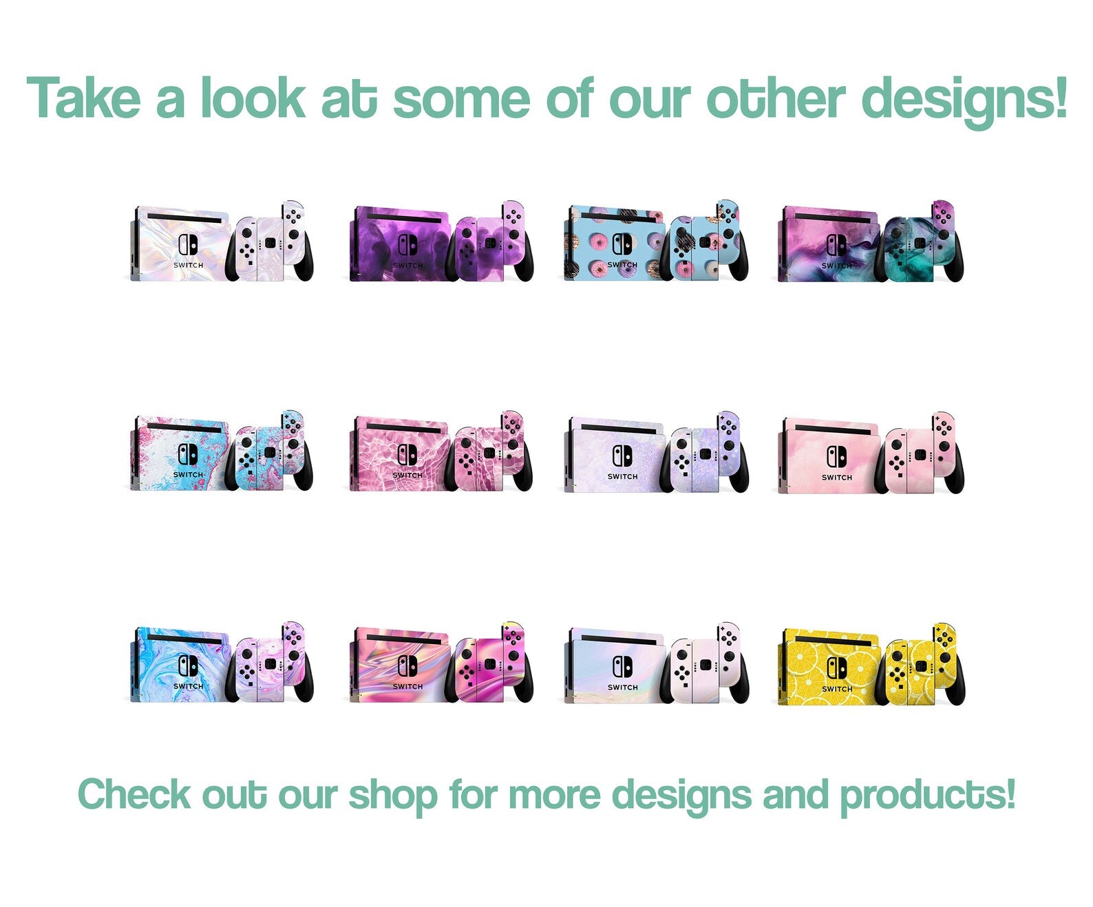 Our skin designs include stickers for the Nintendo Switch console, joy cons and dock.