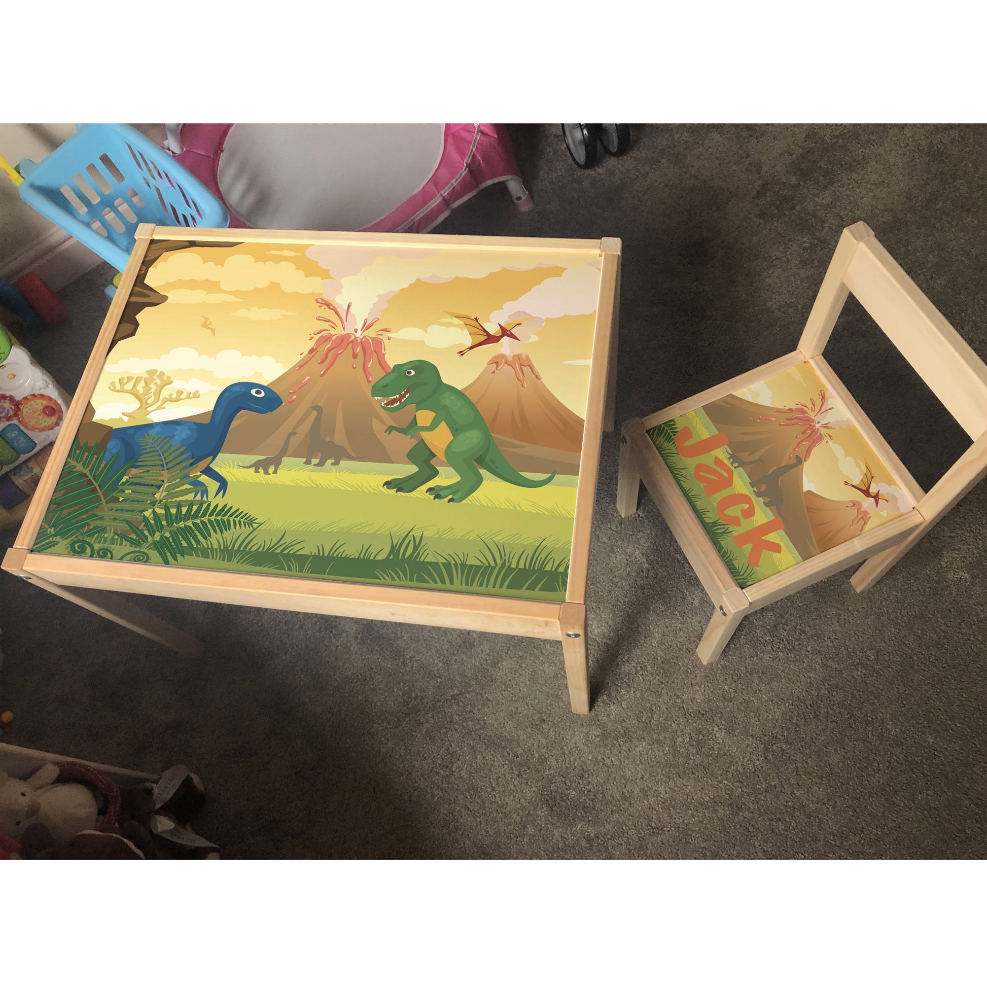 Personalised Children's Table and 1 Chair STICKER Dinosaur Volcano Design