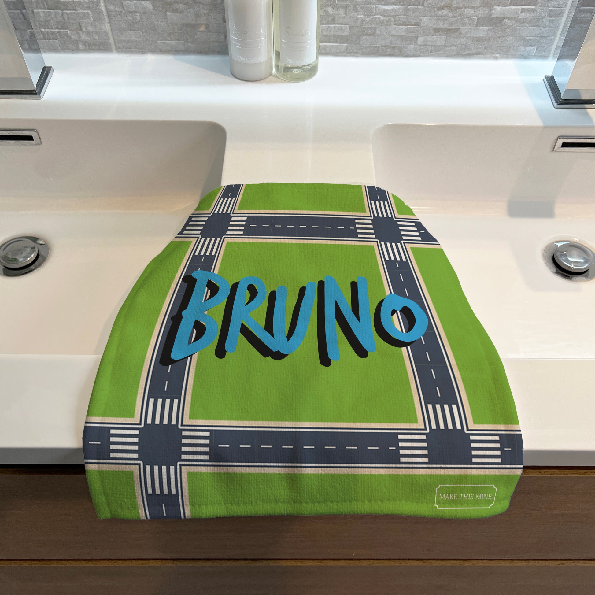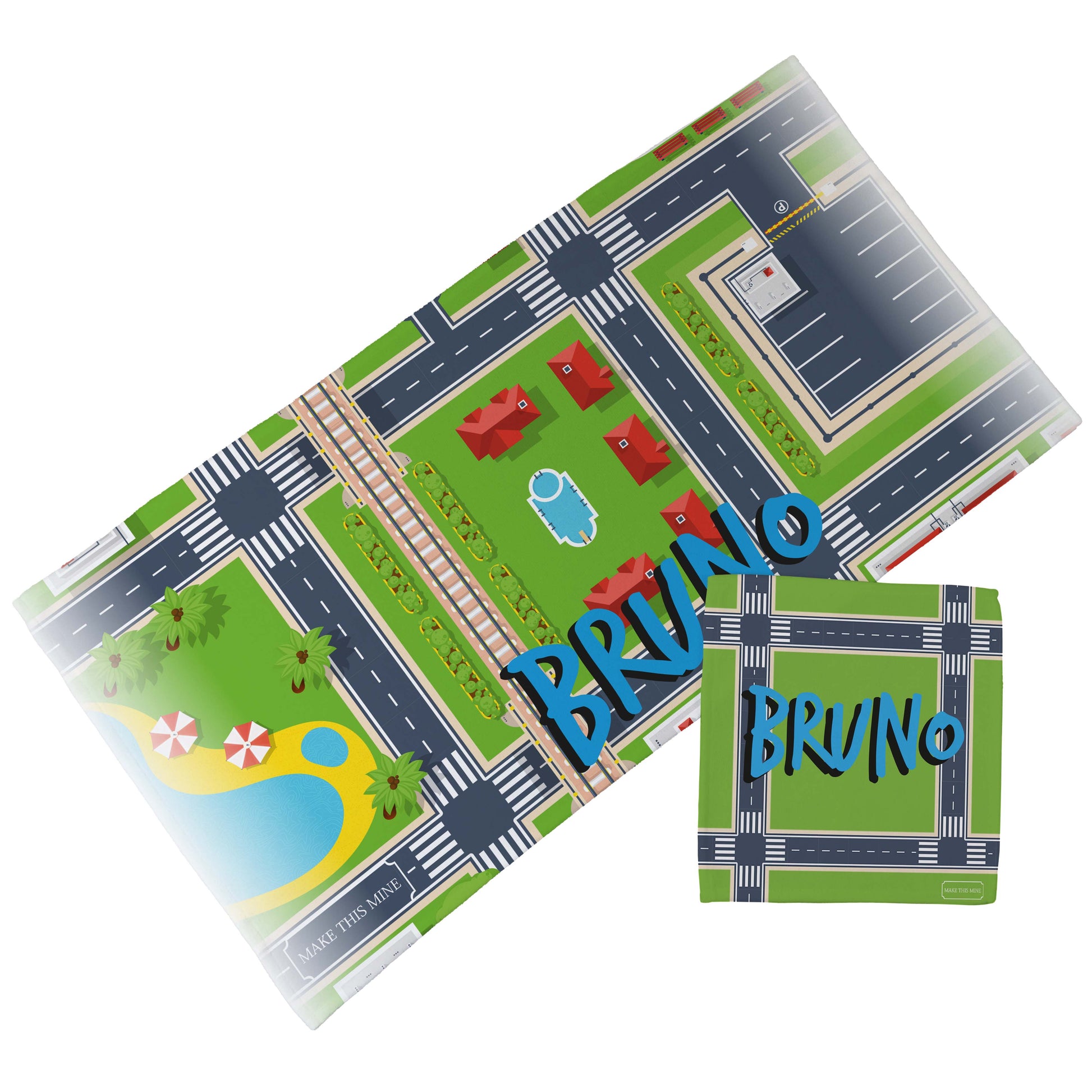 Colourful City design. Bright white towel and face flannel pack with a microfibre front and a 100% cotton back. Perfect for bath time and beach days!