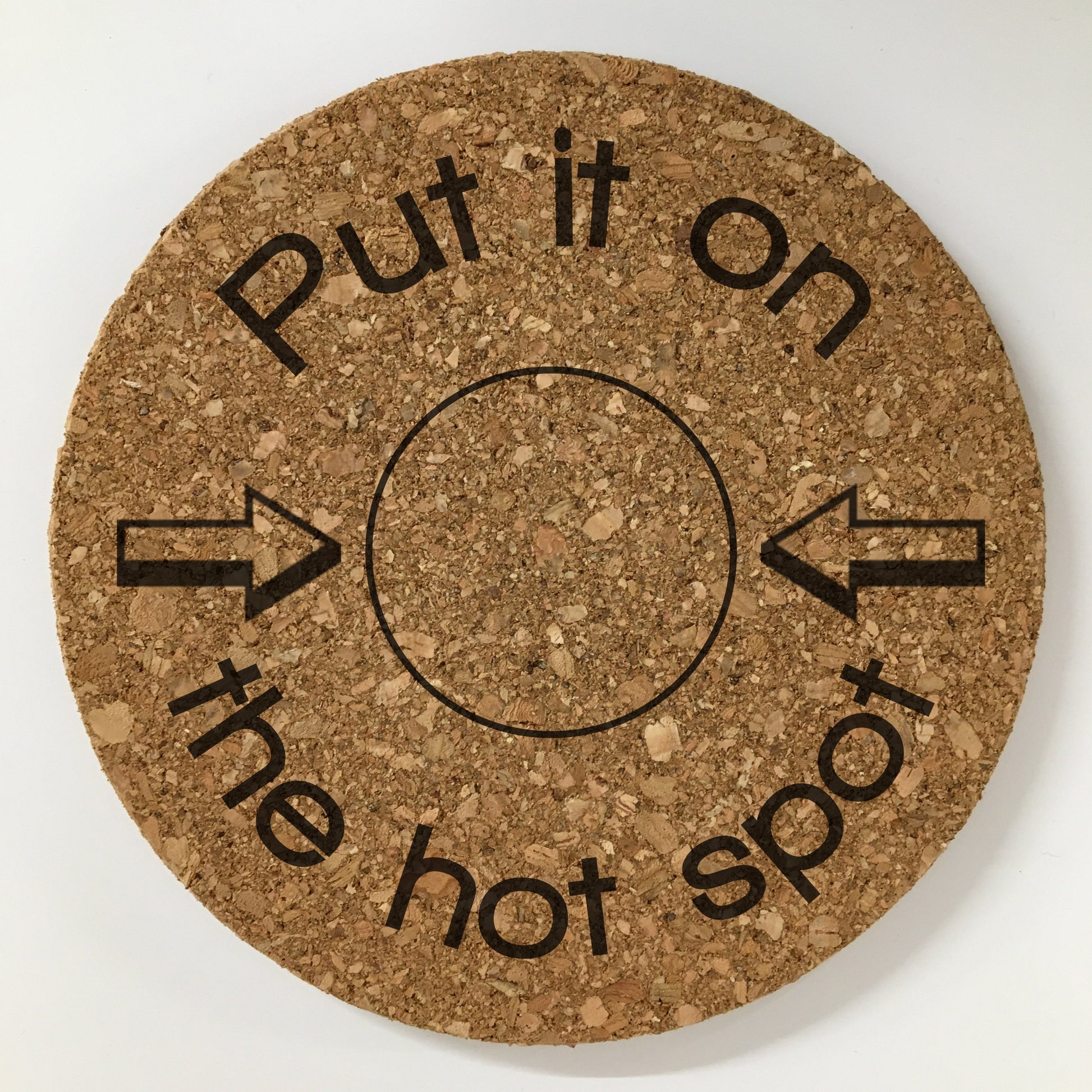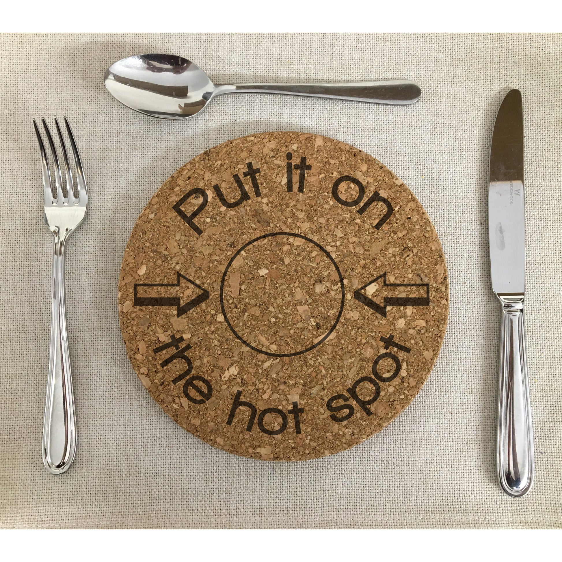 Add a little humour to dinner time! This pre-designed cork pot holder trivet will make the perfect addition to your table.