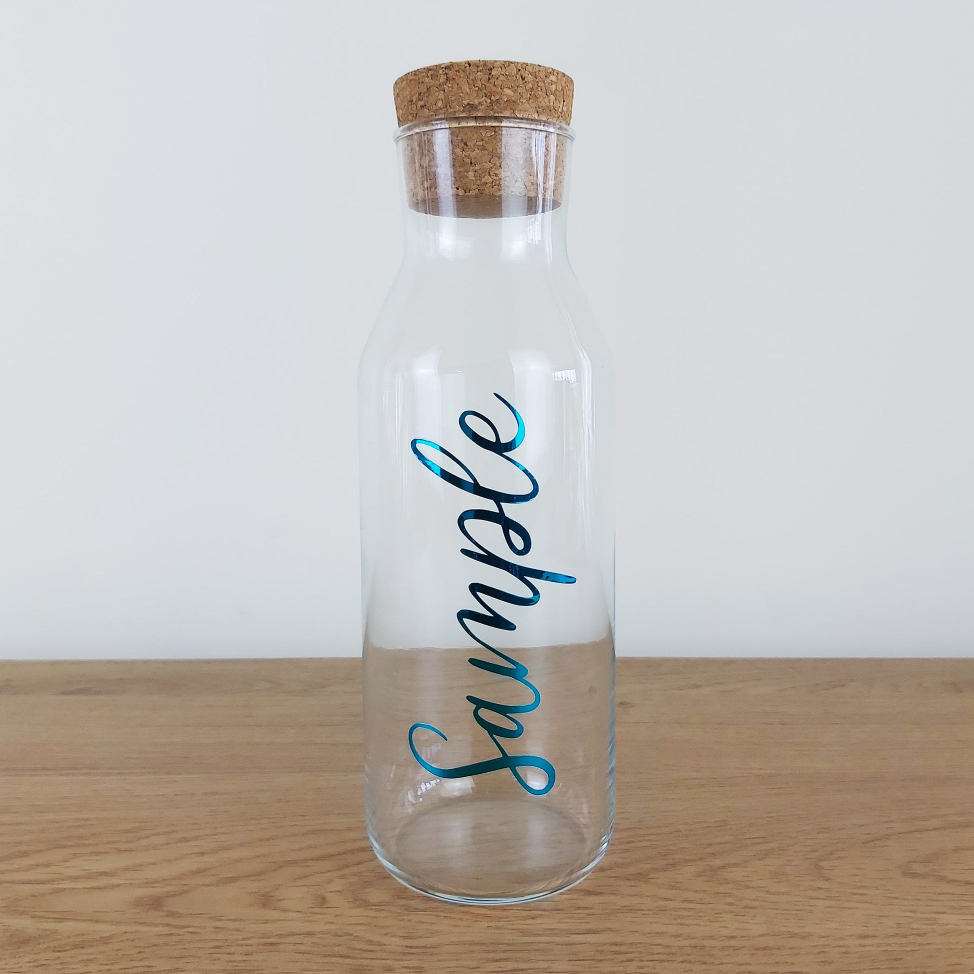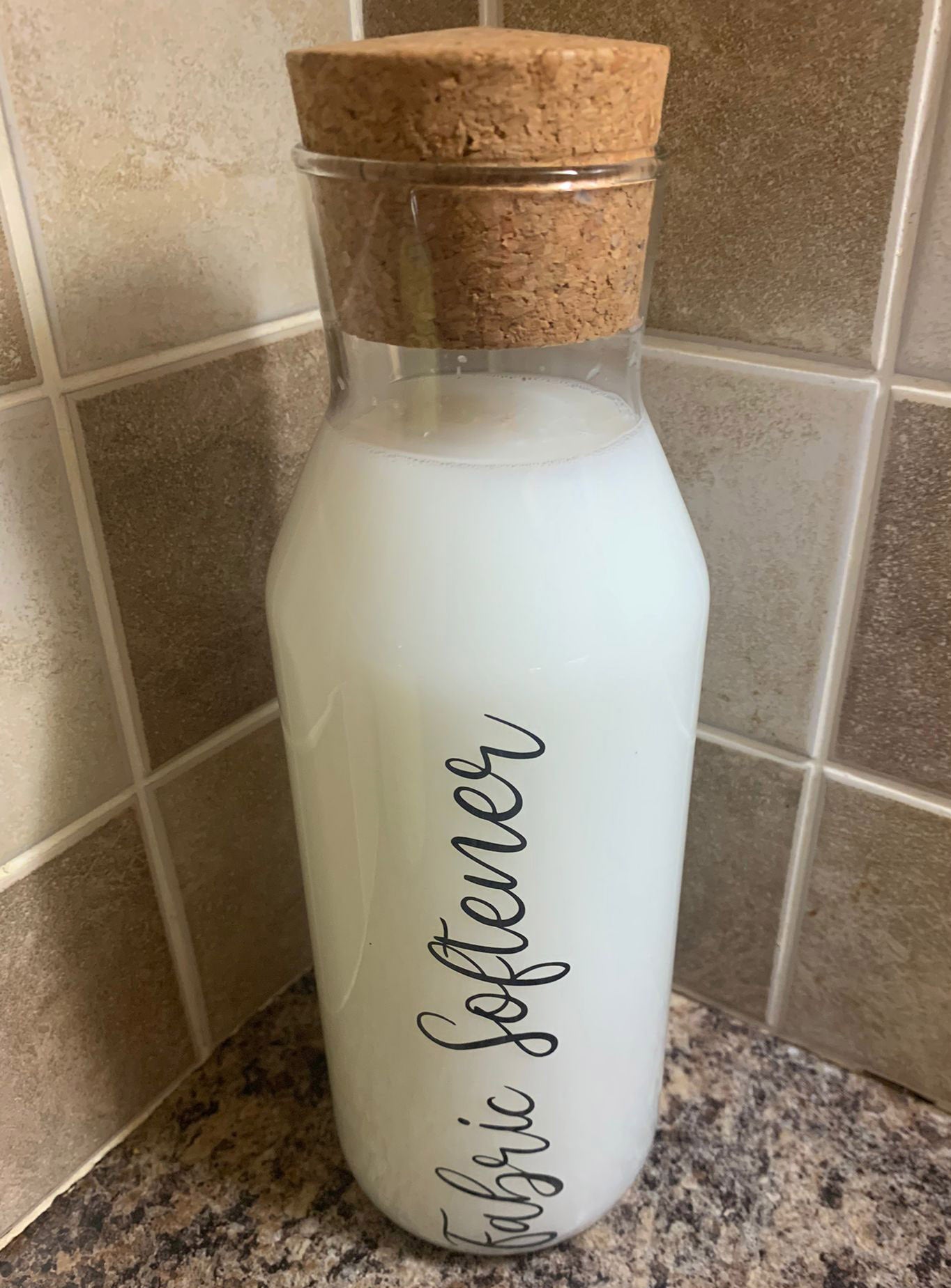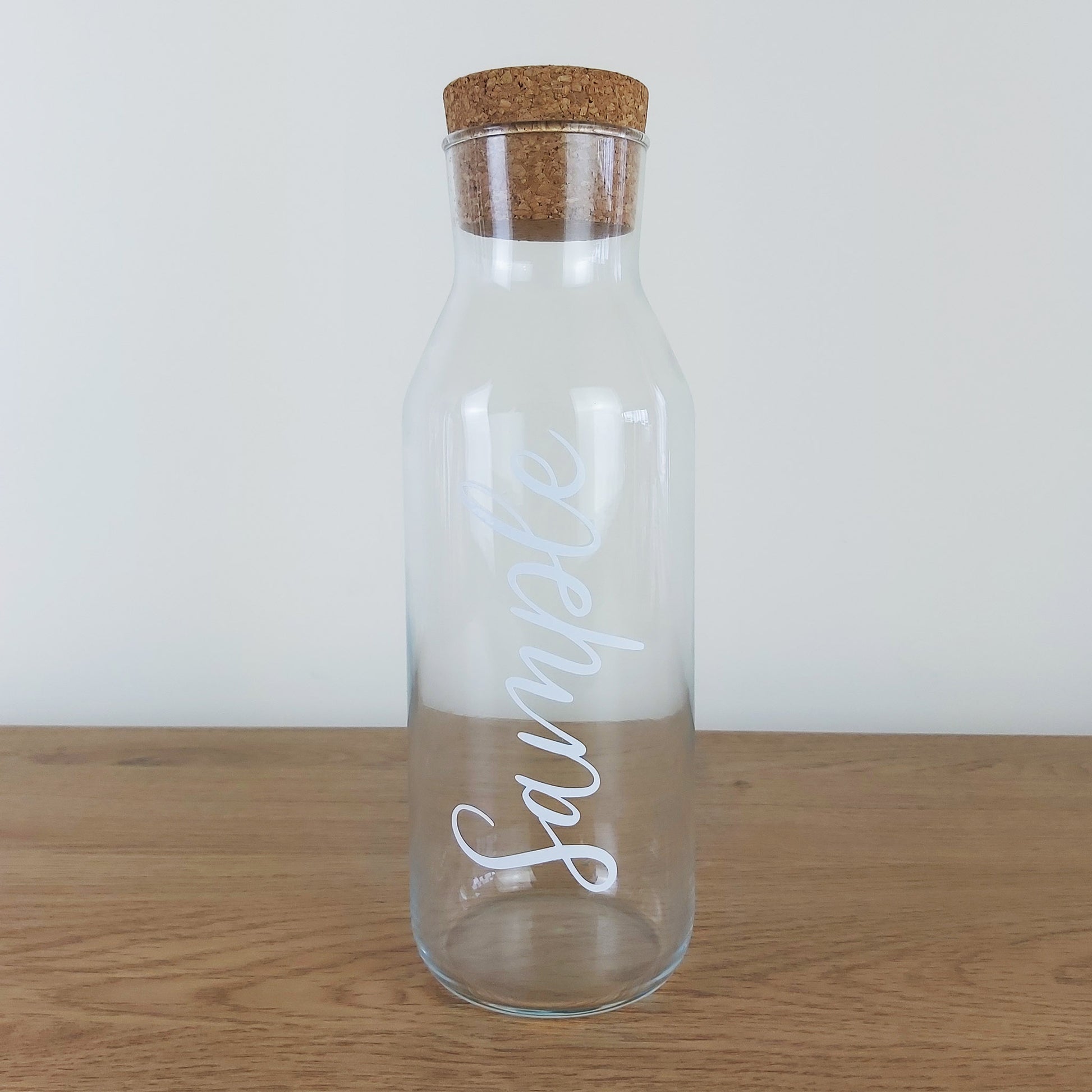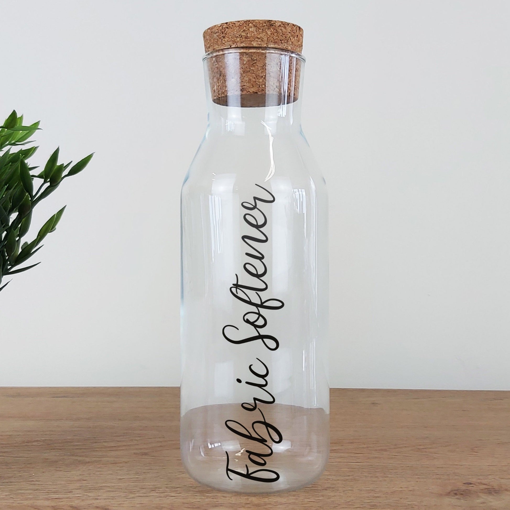 Store your fabric softener in this reusable eco-friendly glass carafe jar with cork lid. Choose from the available vinyl text colour options (see second image) to match the carafe to your decor.