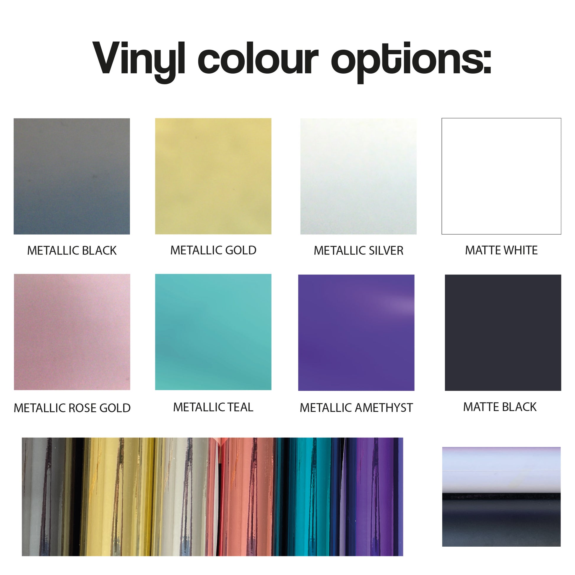 Vinyl colours include: Matte Black, Matte White, Metallic Black, Metallic Silver, Metallic Gold, Metallic Rose Gold, Metallic Amethyst, Metallic Teal