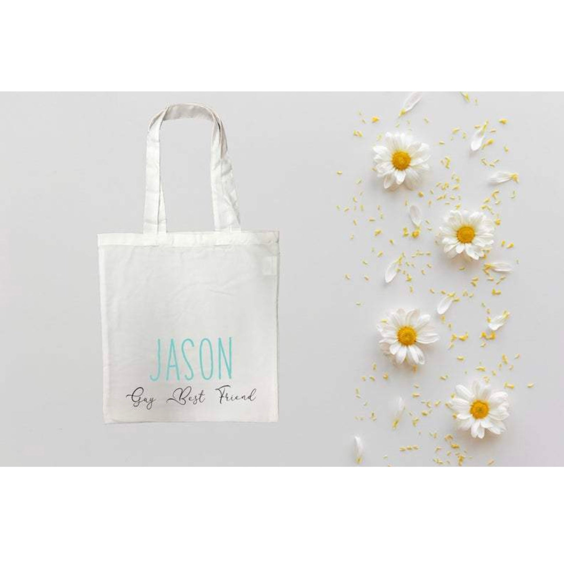 Tote bag is printed with your name and 'Gay Best Friend' underneath.