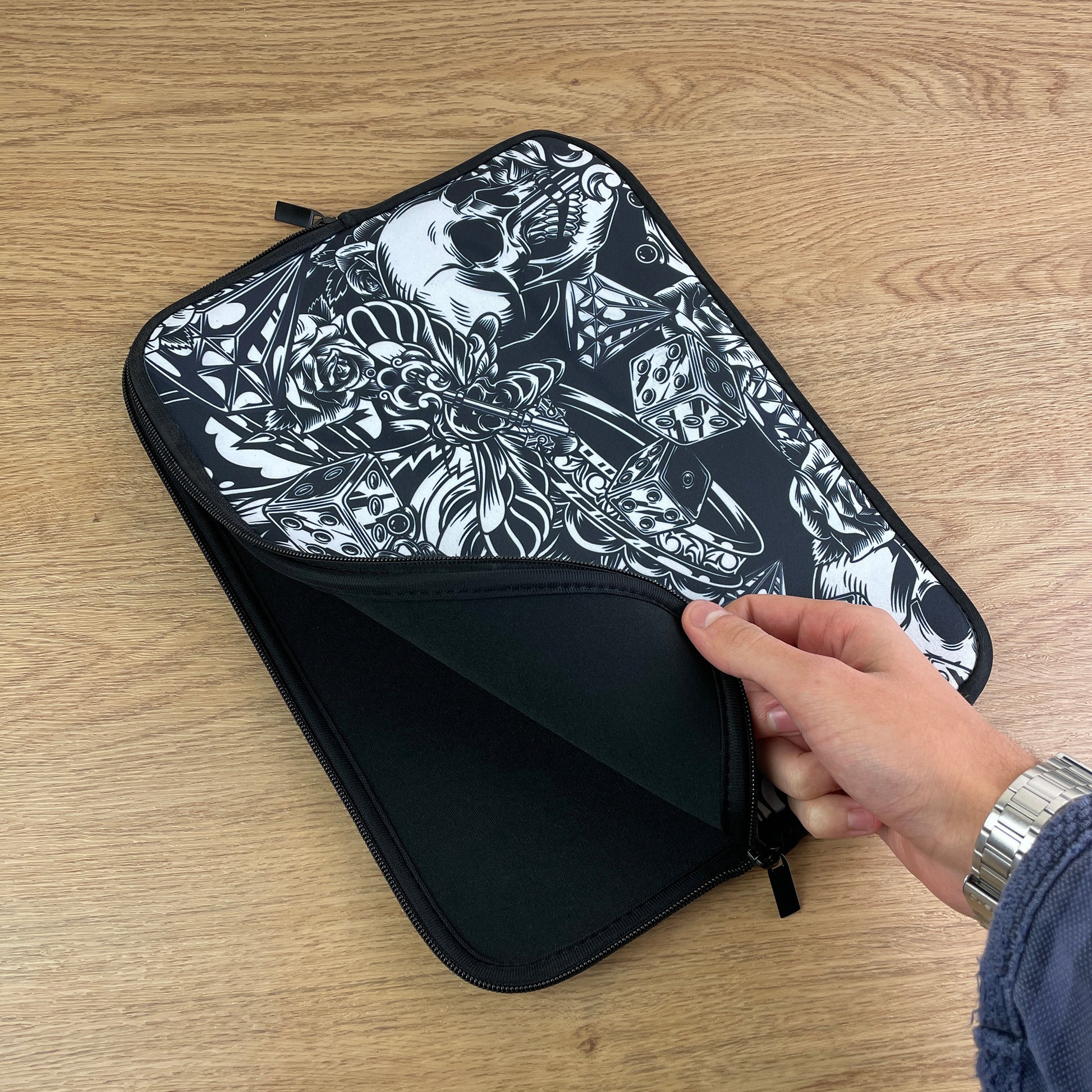 Neoprene laptop sleeve with a printed black and white skulls and roses design. Perfect for use in the office or out and about, and makes a wonderful gift for friends and family.