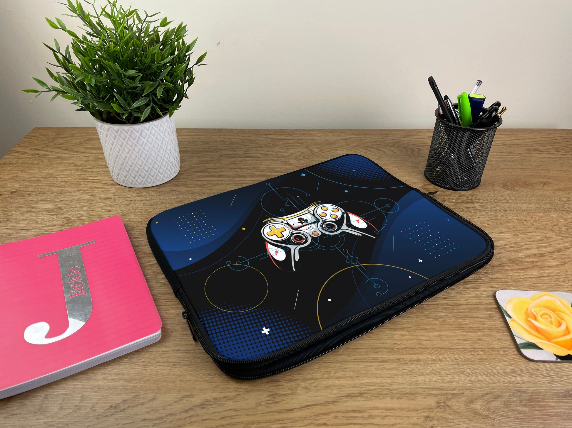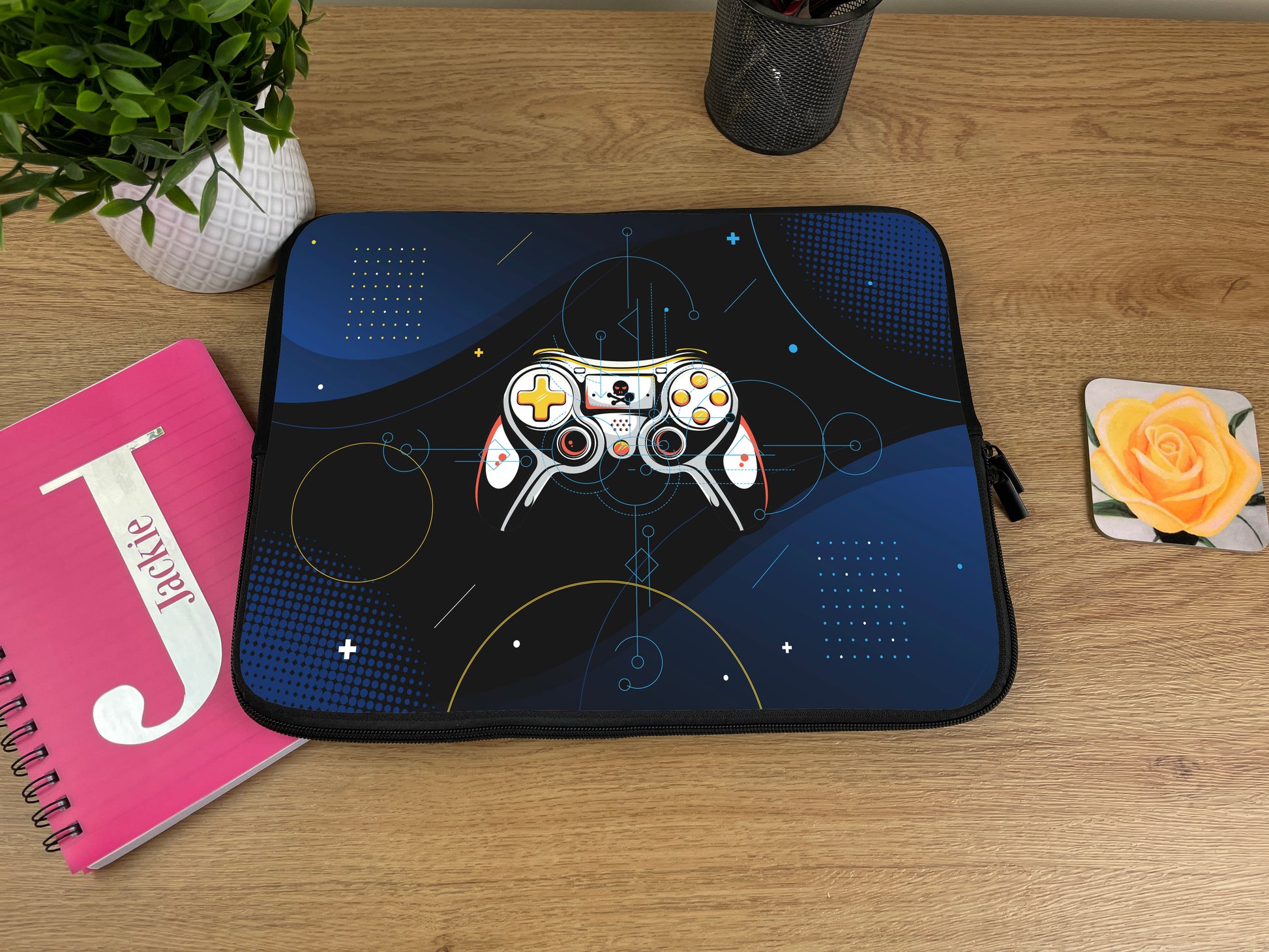 Neoprene laptop sleeve with a printed galactic game controller design. Perfect for use in the office or out and about, and makes a wonderful gift for friends and family.