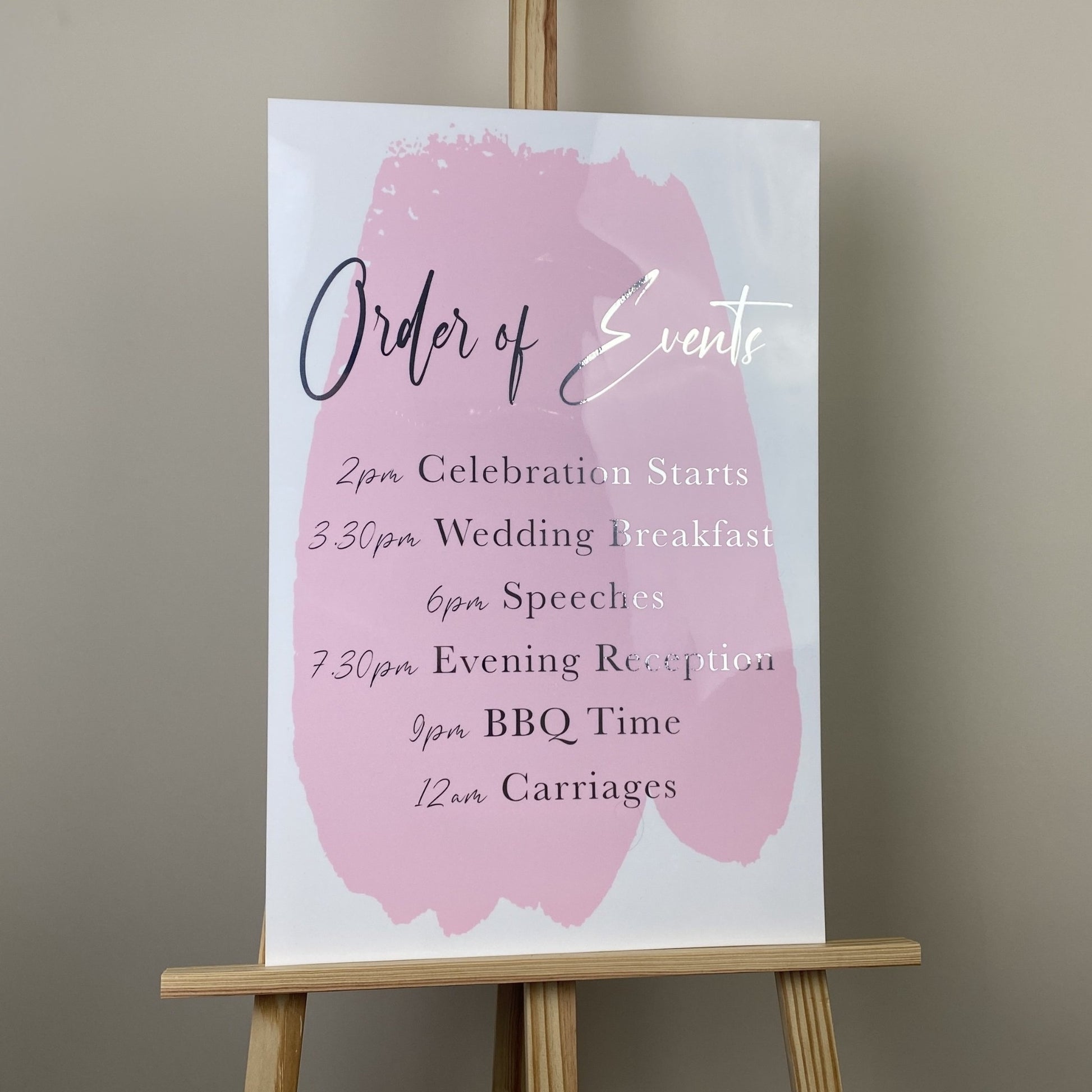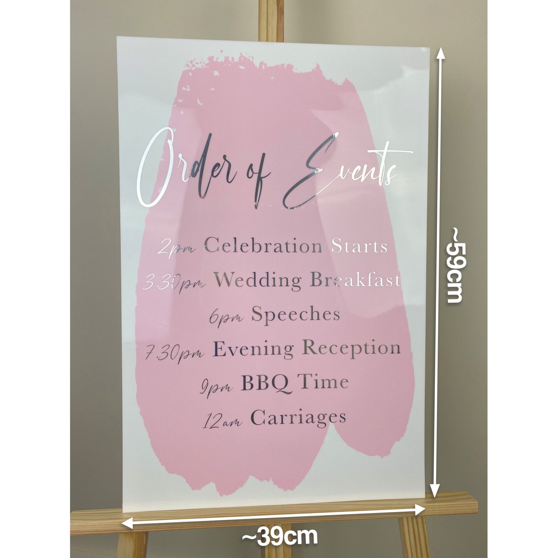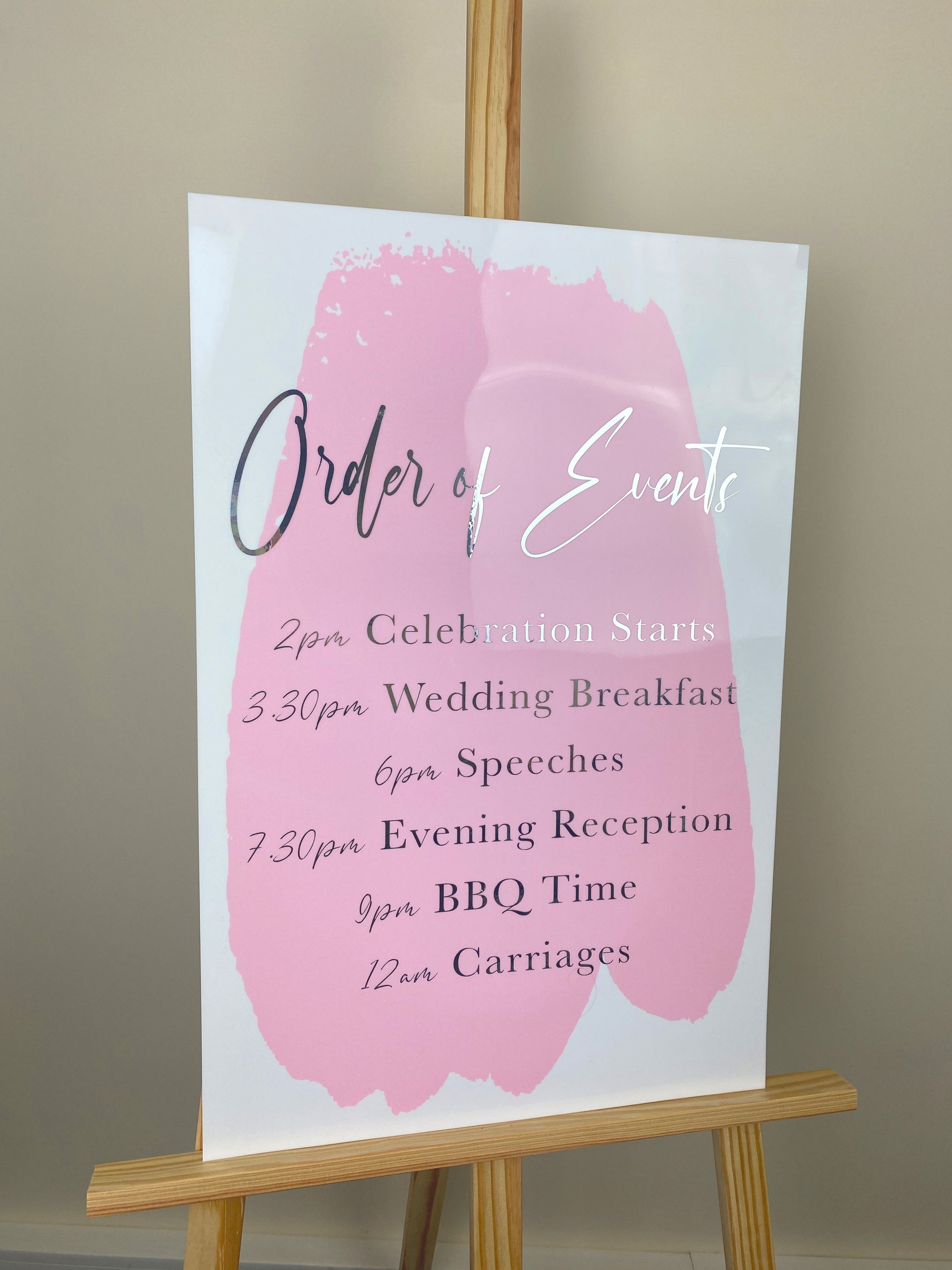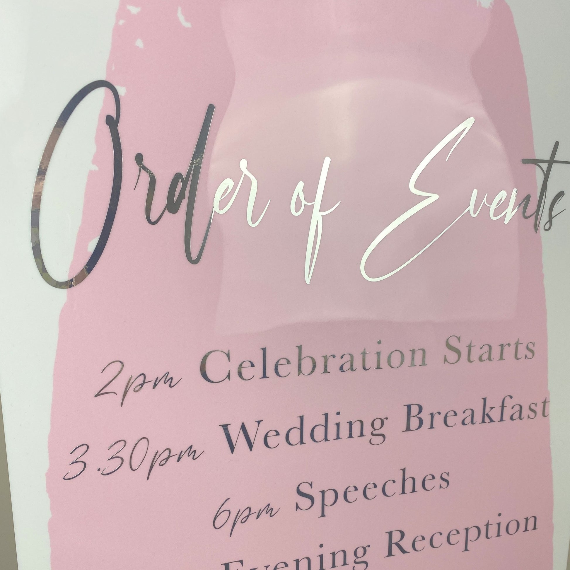 Inform your guests with a personalised order of events sign! Choose your background and vinyl colour to fit your wedding theme perfectly.