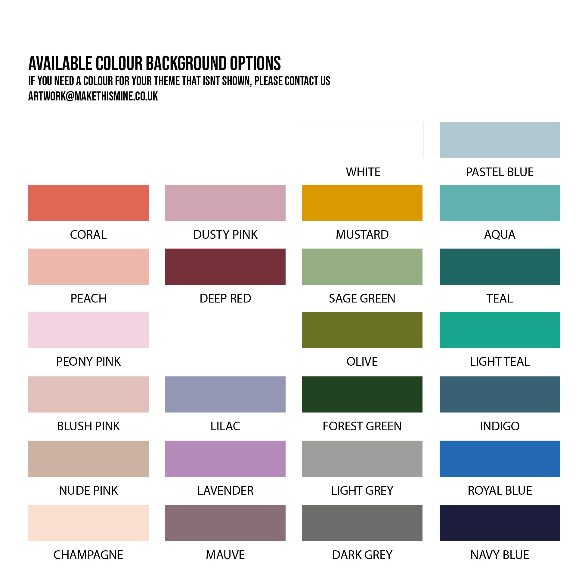CUSTOM: We can do any colour background, please contact us if you would like a colour that is not shown. we understand everything has to be perfectly matched for a social event, so we are happy to help!