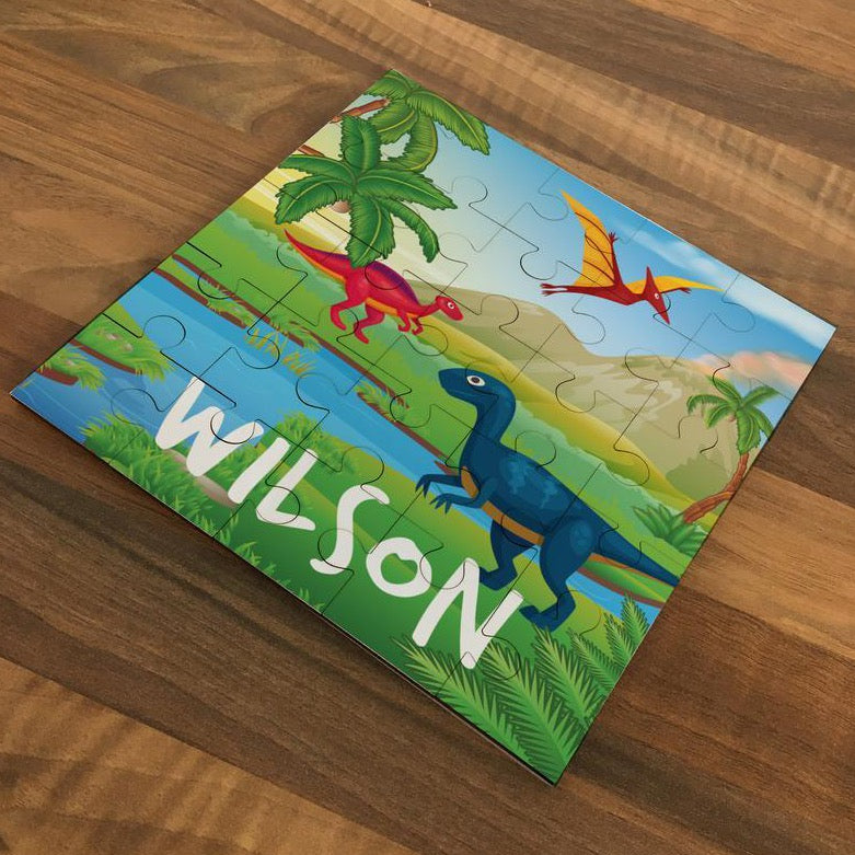 MDF 25pcs Dinosaur Square Jigsaw Puzzle with choice of a Storage Gift Bag, both with the dinosaur image and personalised name printed on.