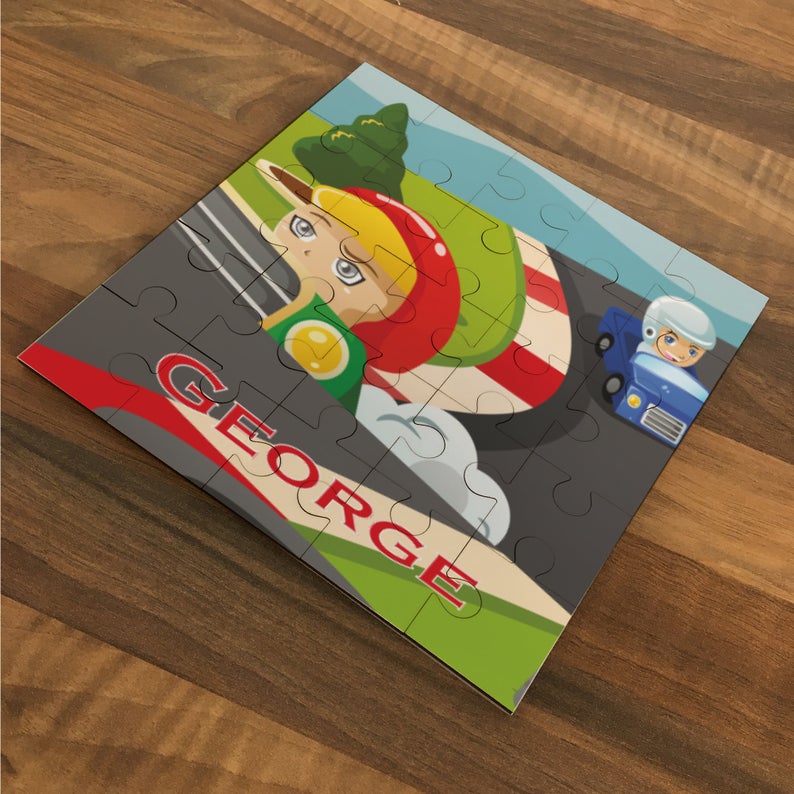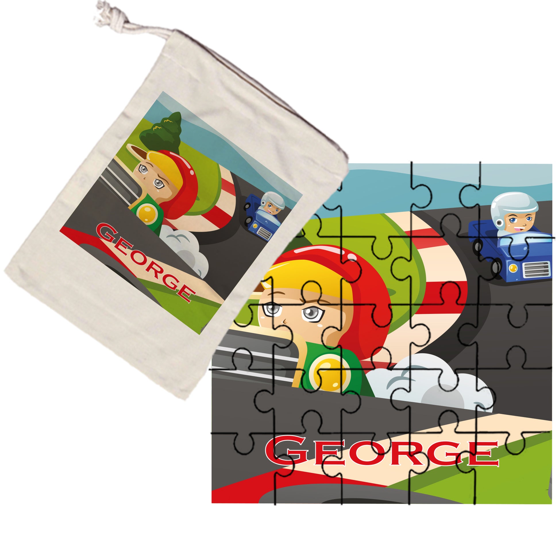 MDF 25pcs Race Car Square Jigsaw Puzzle with Storage Gift Bag, both with the race car image and personalised name printed on.