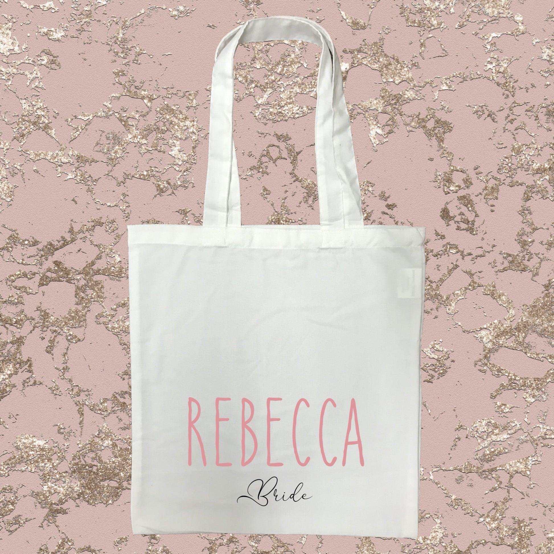 Tote bag is printed with your name and 'BRIDE' underneath.