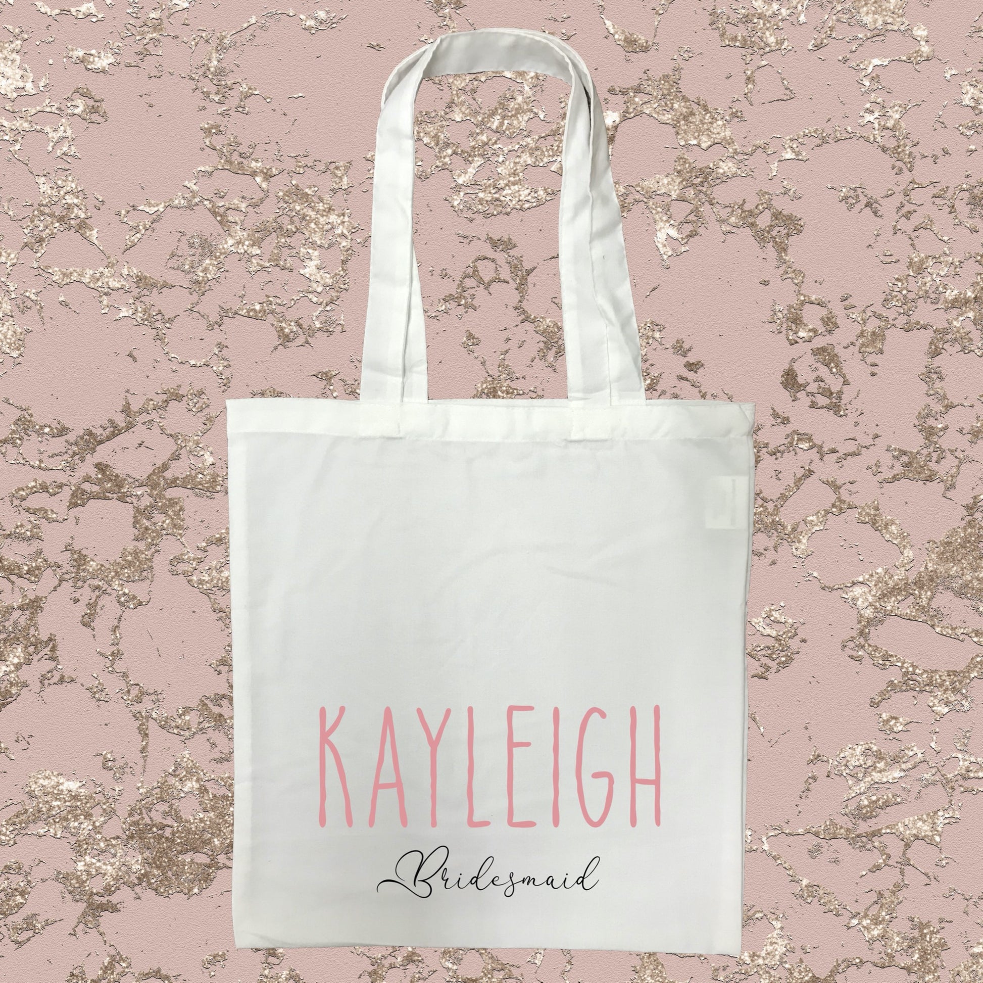 Tote bag is printed with your name and 'BRIDESMAID' underneath.