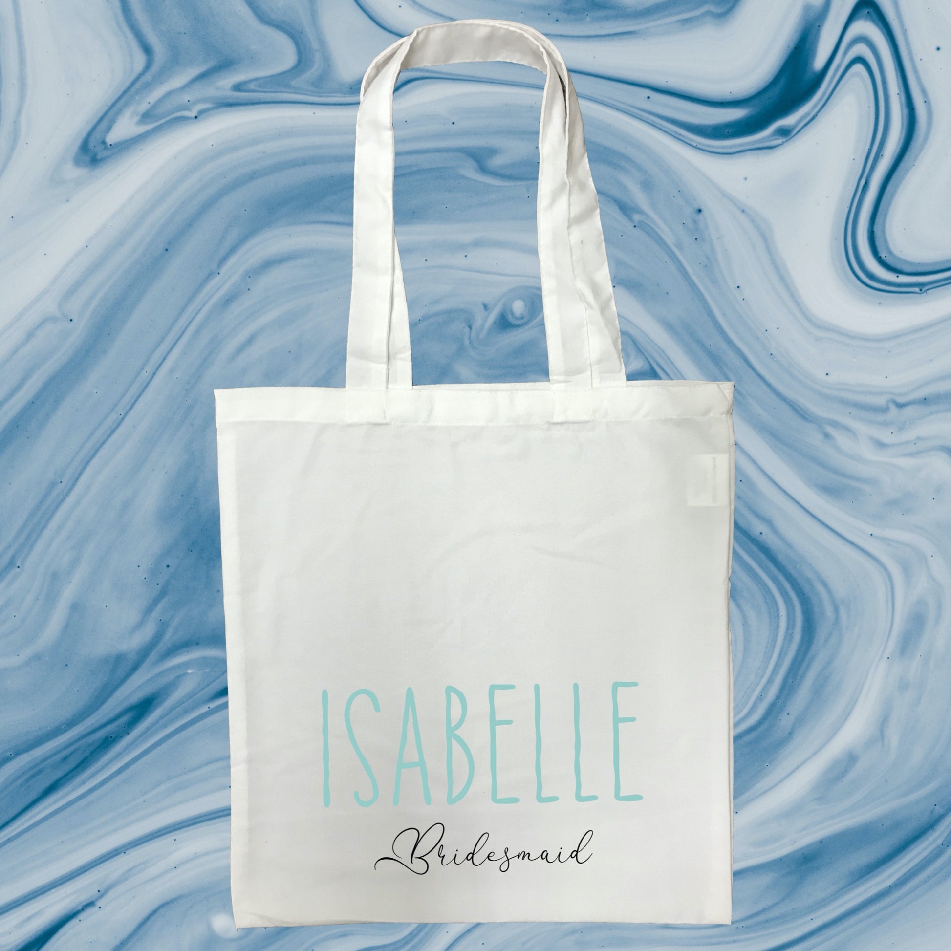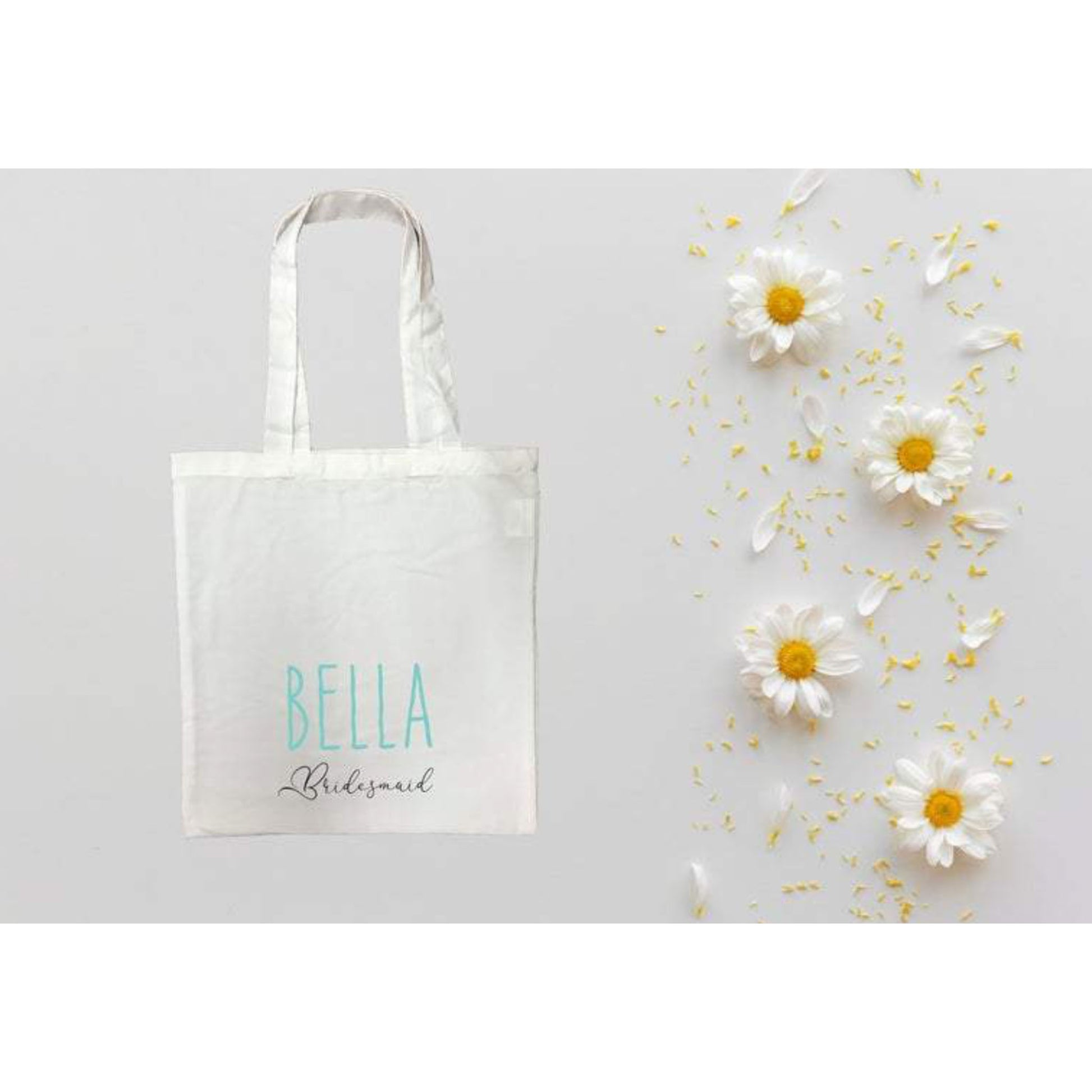 Tote bag is printed with your name and 'BRIDESMAID' underneath.