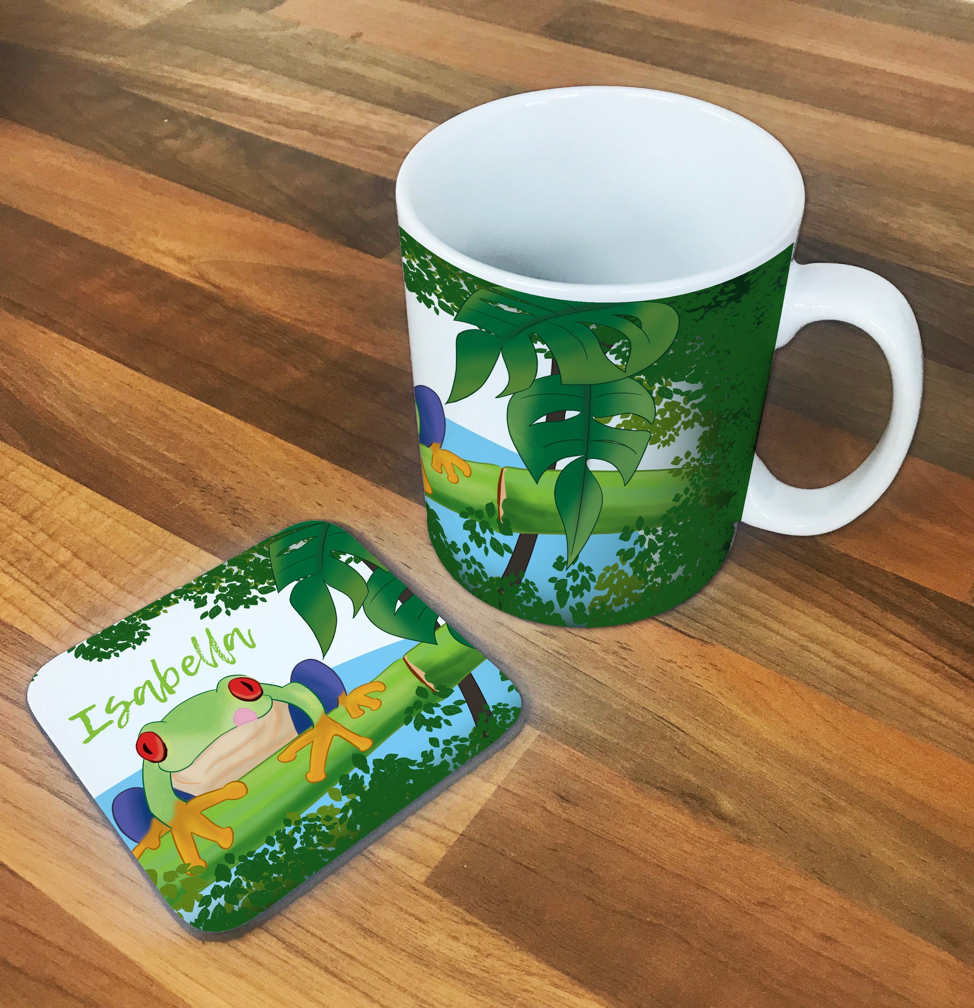 Fantastic colourful frog design. Our personalised mug & coaster sets make excellent fun gifts ideal for family and friends.