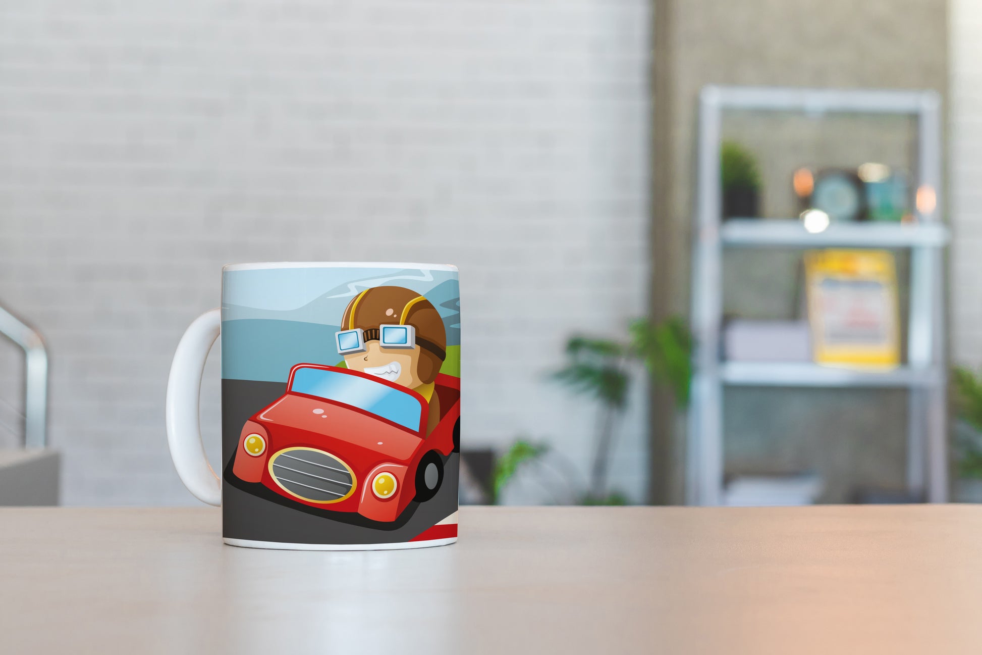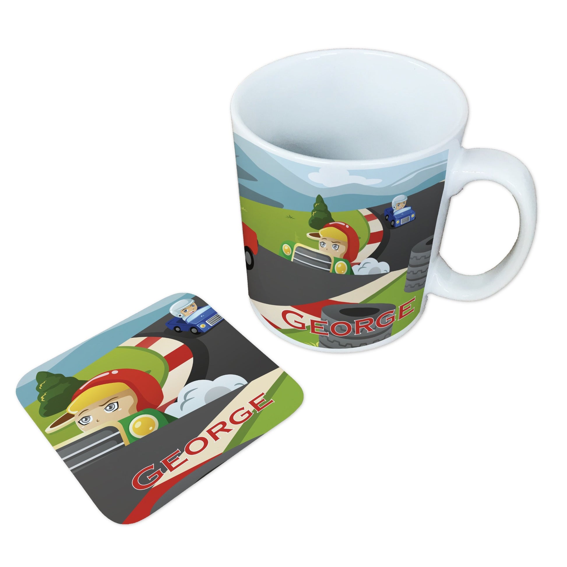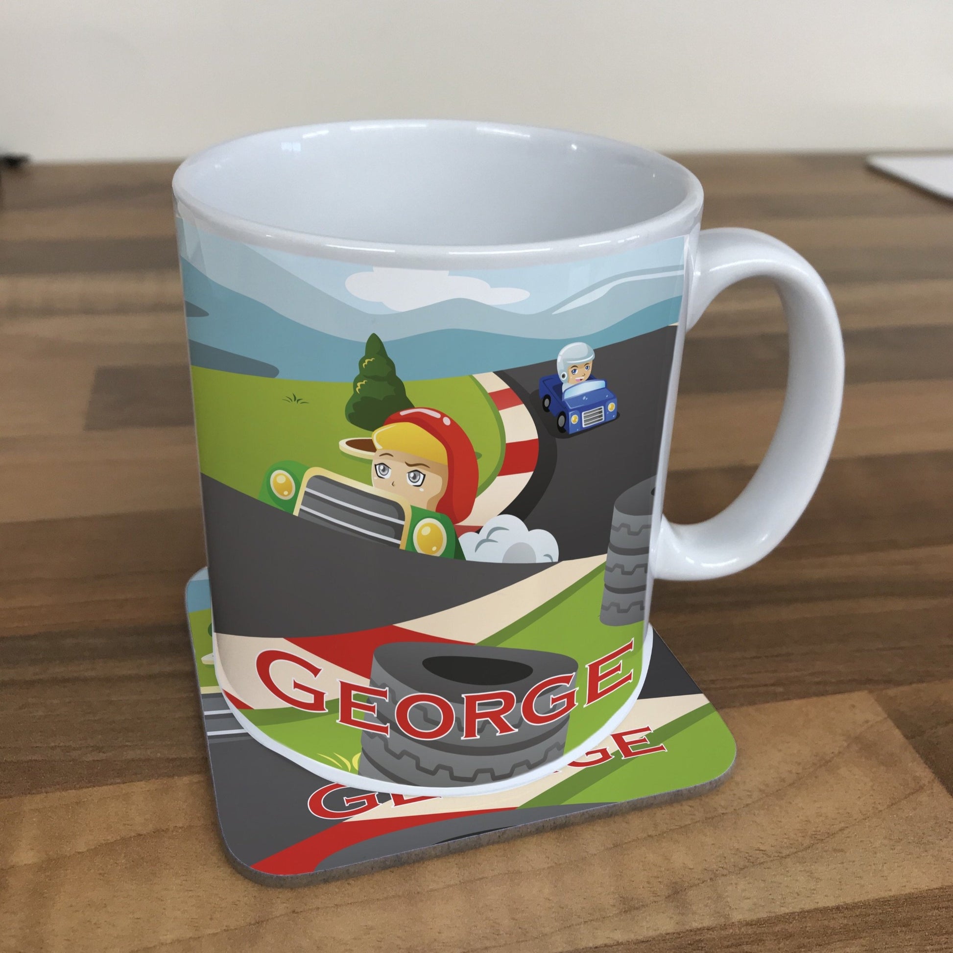 Fantastic colourful racecar design. Our personalised mug & coaster sets make excellent fun gifts ideal for family and friends.