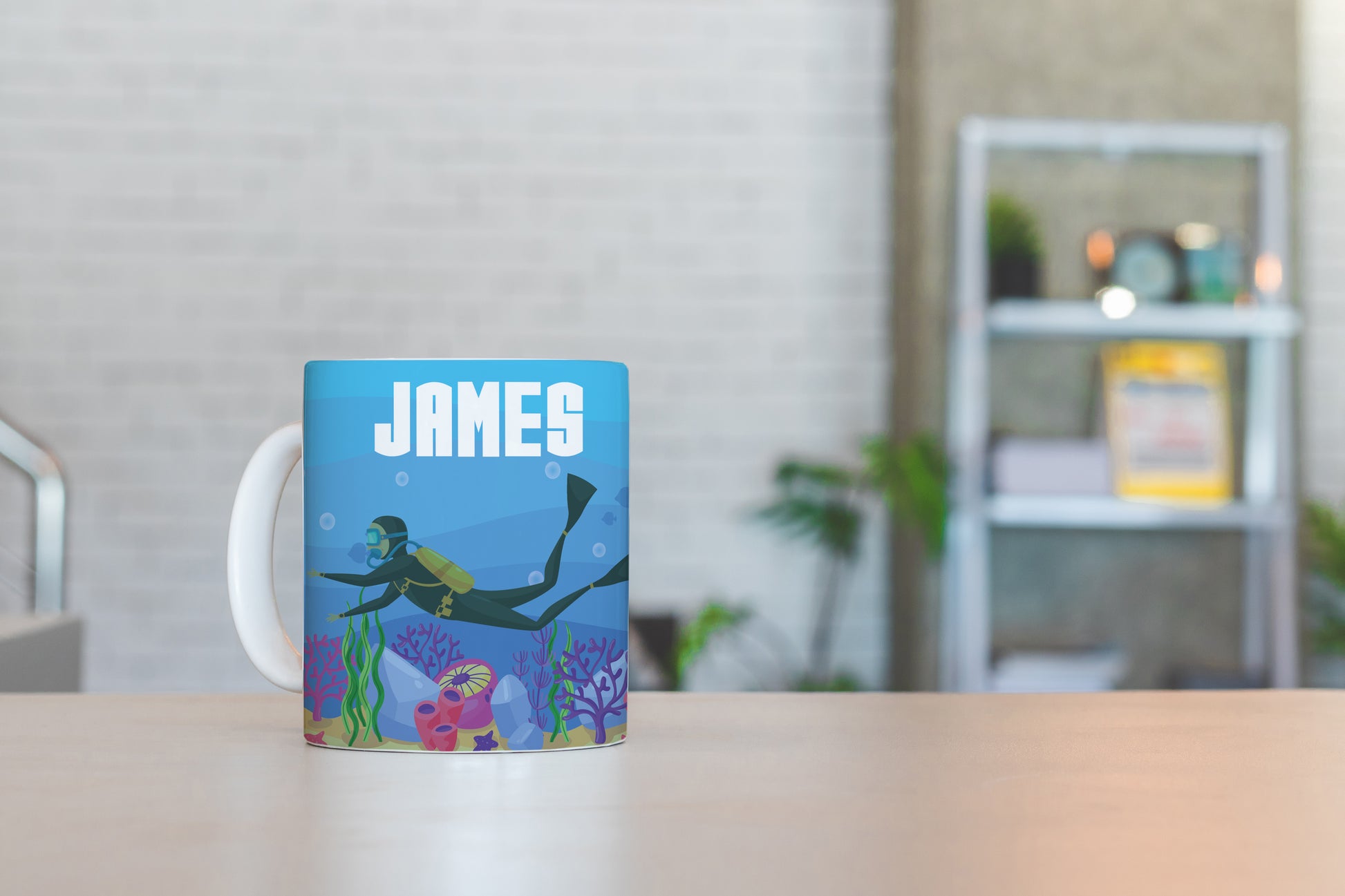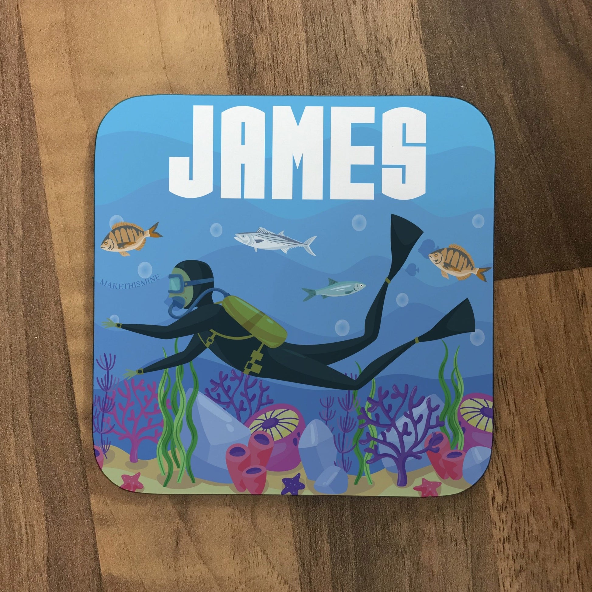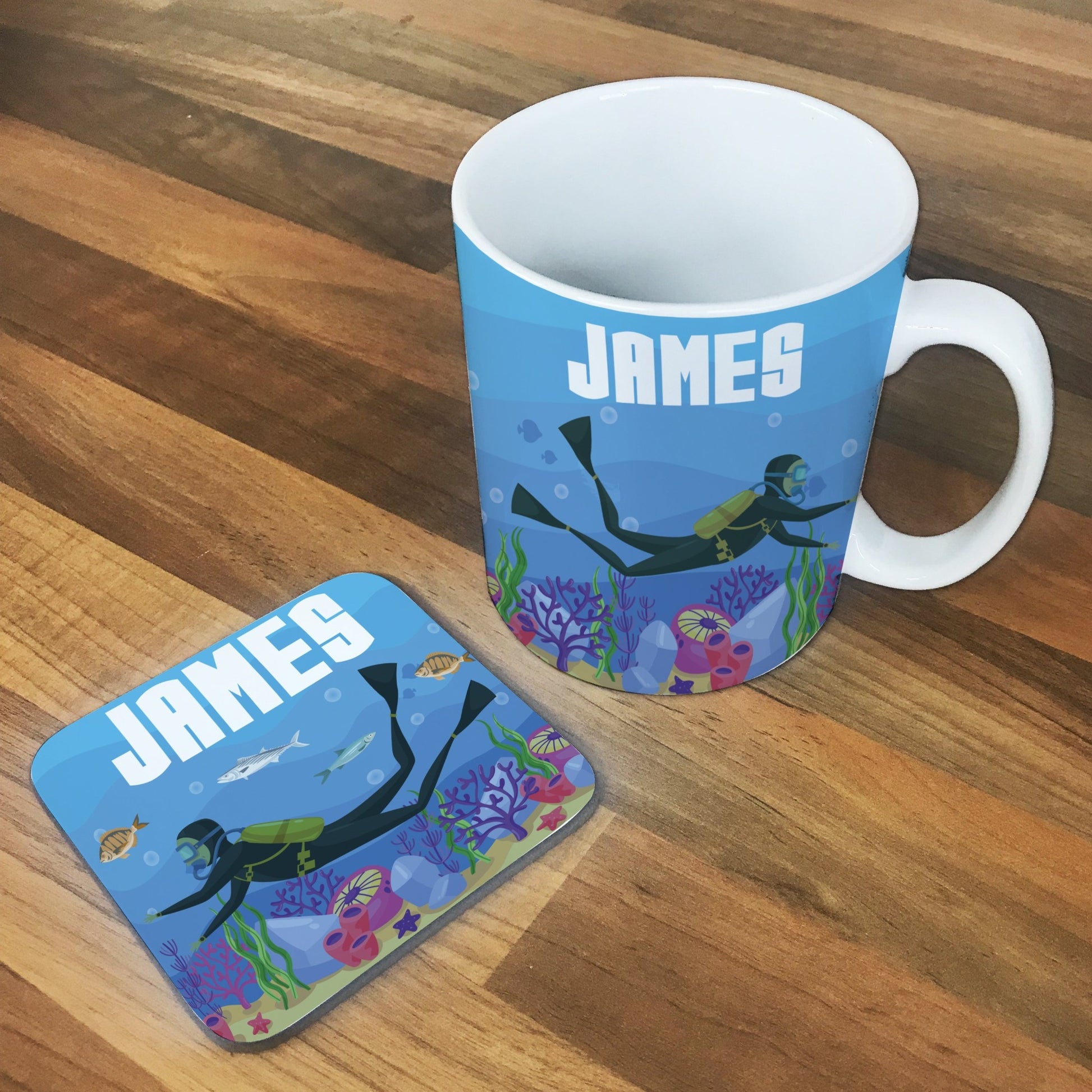 Fantastic colourful scuba design. Our personalised mug & coaster sets make excellent fun gifts ideal for family and friends.