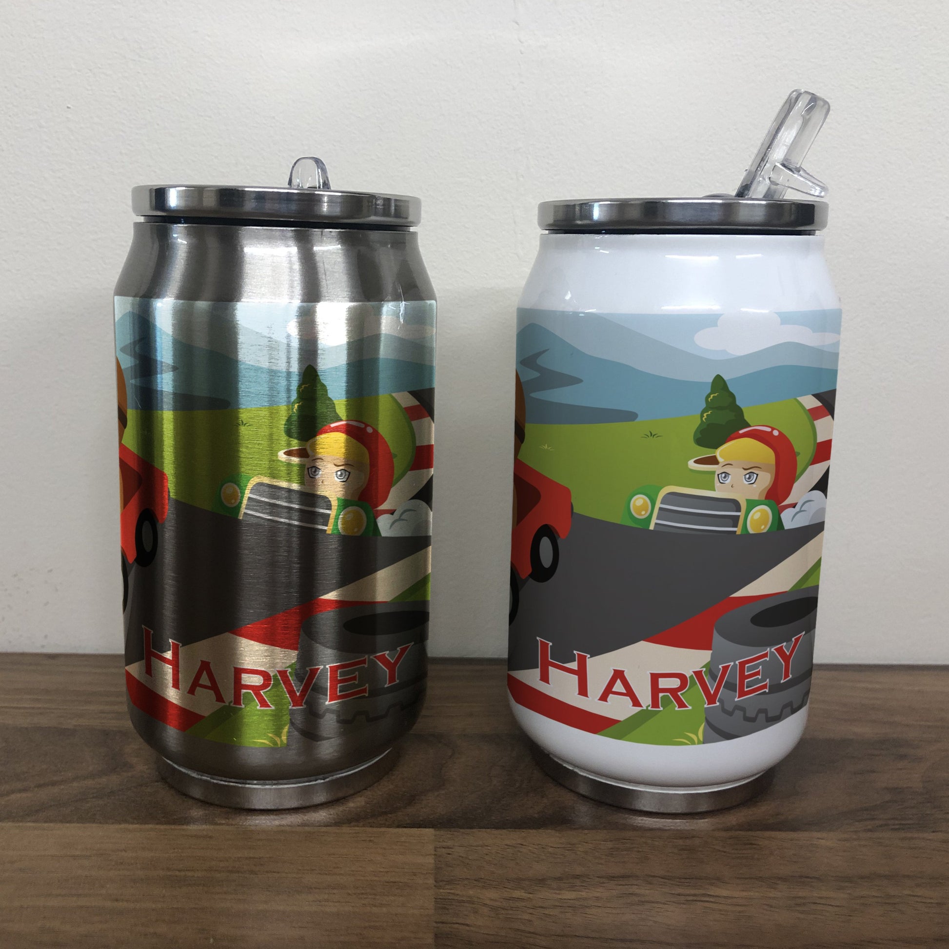 Fantastic reusable Coke style can with a colourful racecar wrap design. Our personalised racecar drinks can makes an excellent fun gift ideal for family and friends.
