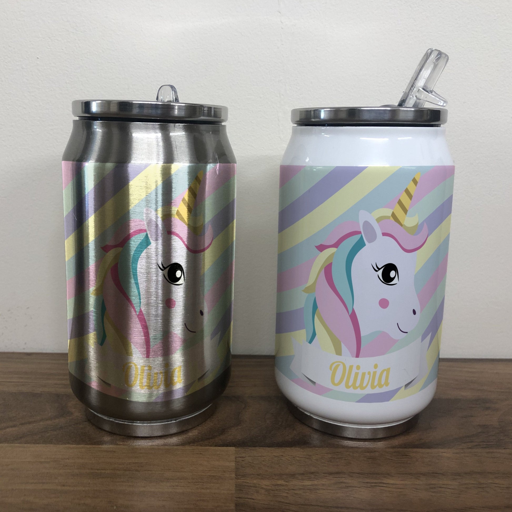 Fantastic reusable Coke style can with a colourful striped unicorn wrap design. Our personalised drinks can makes an excellent fun gift ideal for family and friends.