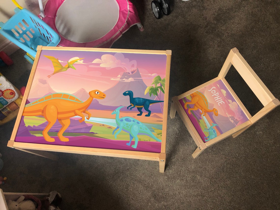 Personalised Children's Table and 1 Chair Printed Pink Dinosaur Landscape Design