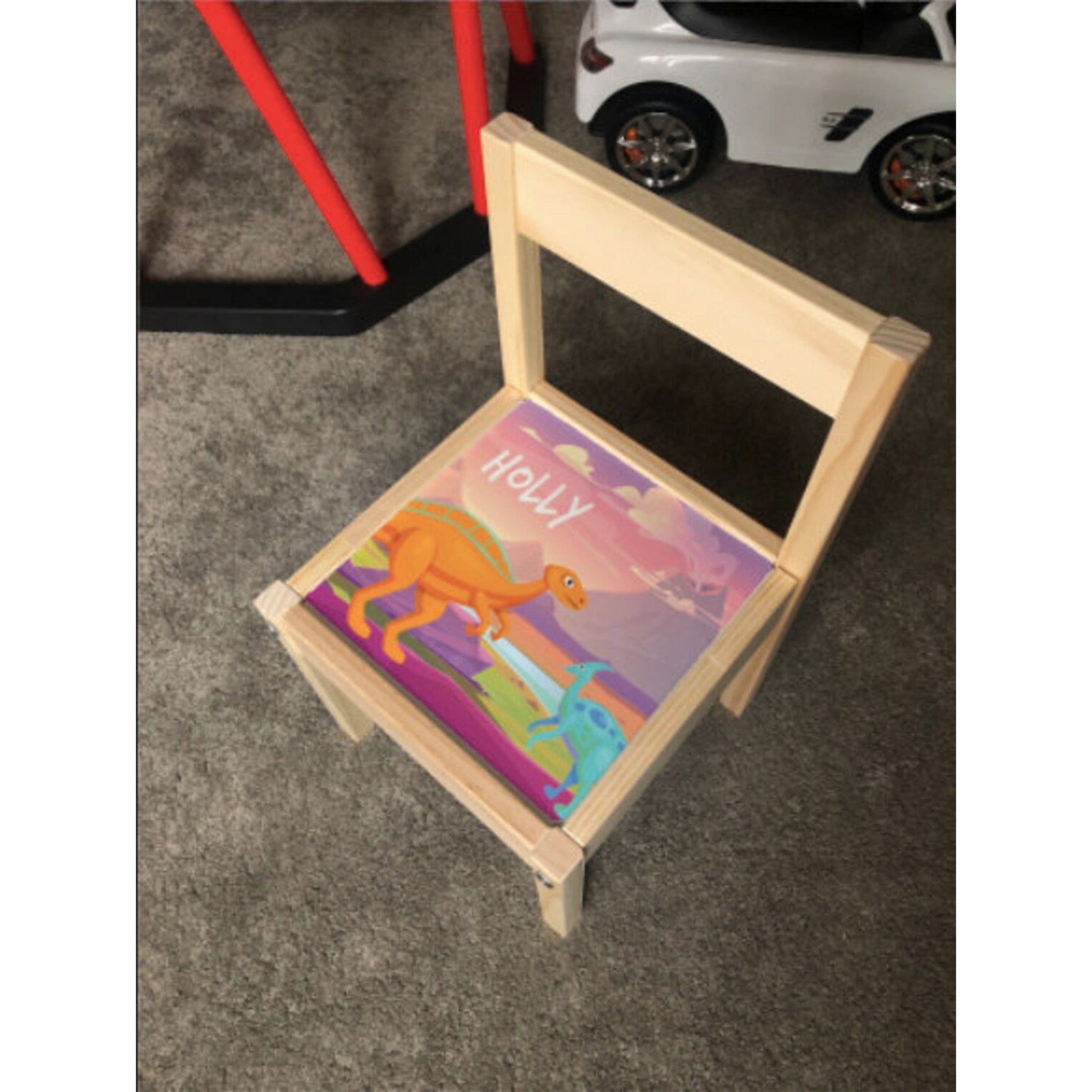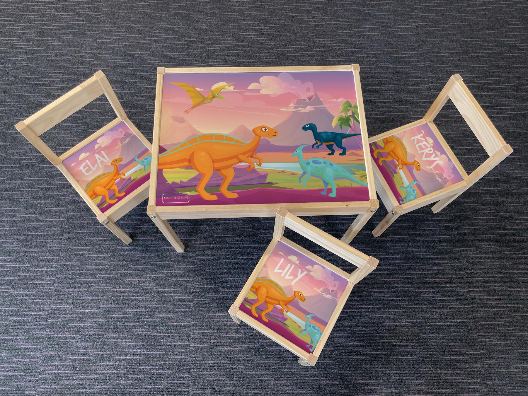 Personalised Children's Table and 3 Chairs Printed Pink Dinosaur Landscape Design