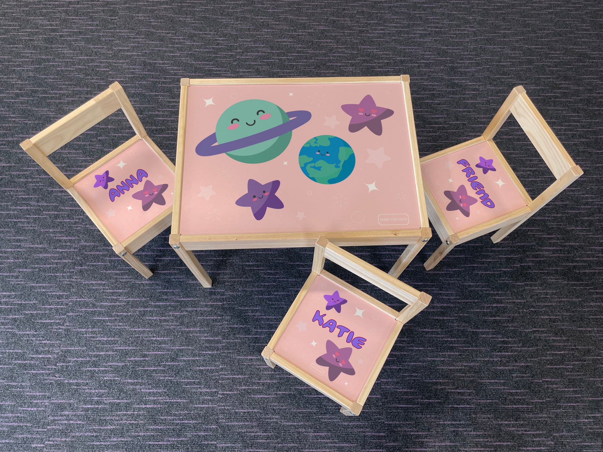 Personalised Children's Table and 3 Chairs Printed Pink Stars Planets Design