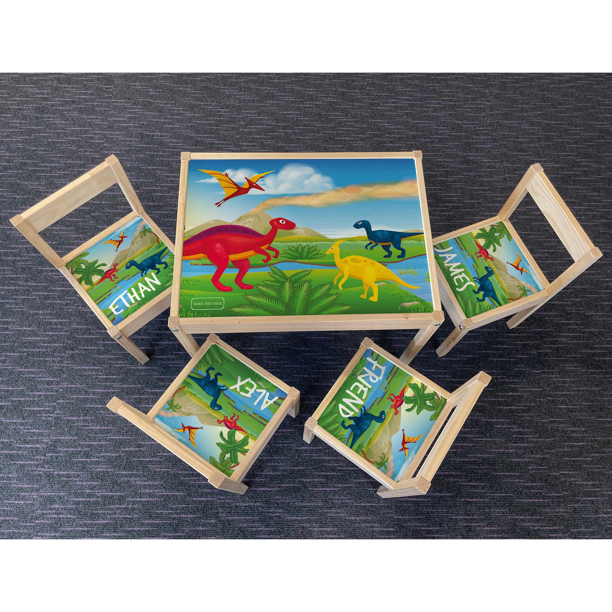 Personalised Children's Table and 4 Chairs Printed Dinosaur Landscape Design
