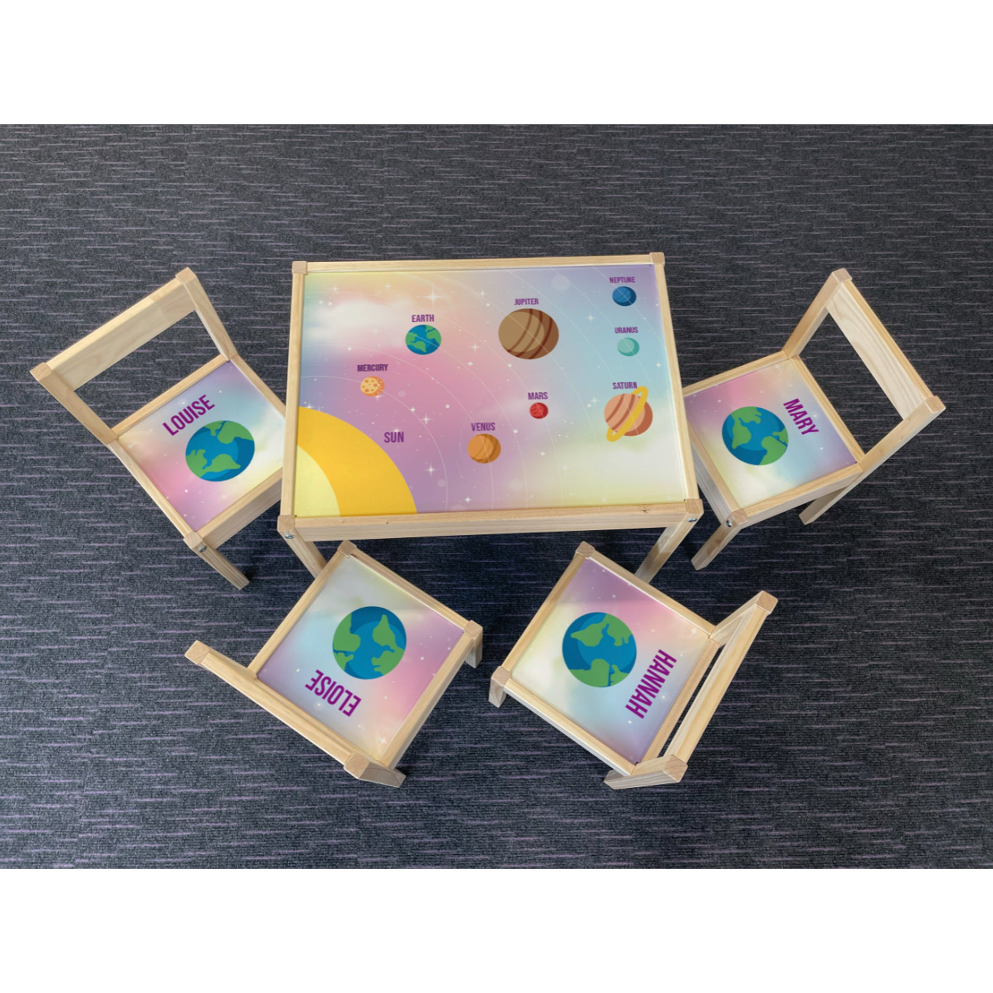 Personalised Children's Table and 4 Chairs Printed Pink Planets Design