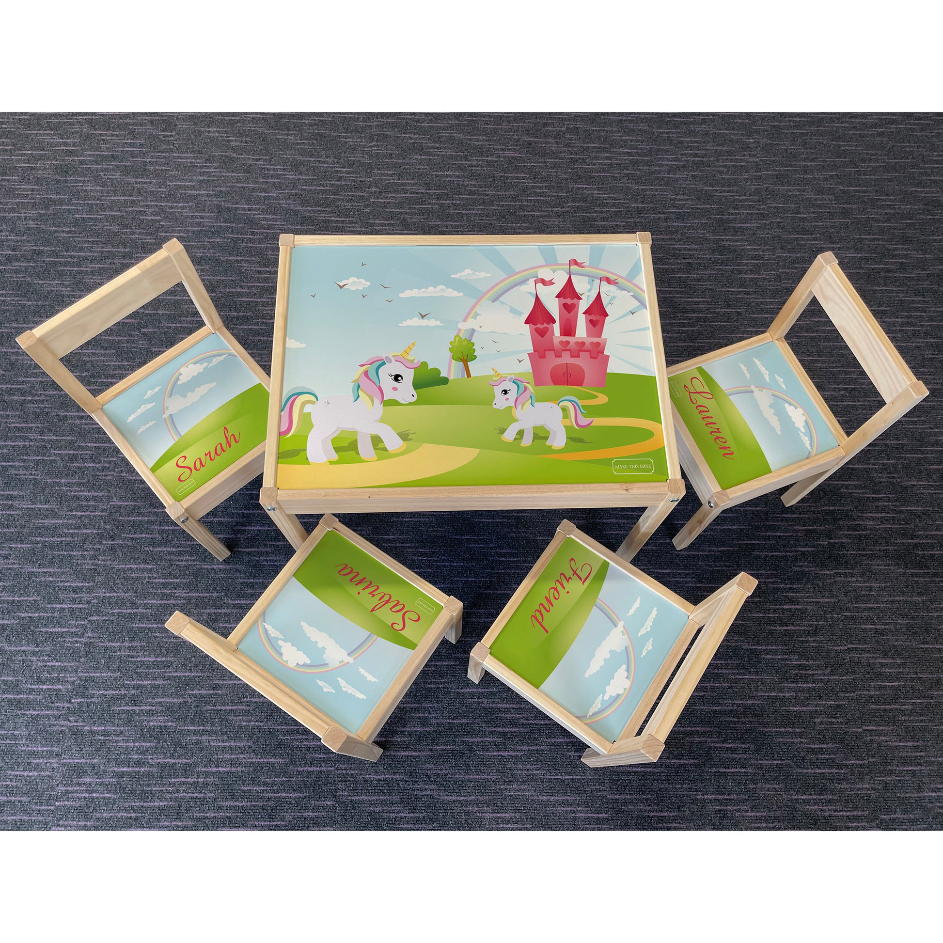 Personalised Children's Table and 4 Chairs Printed Unicorn Fairytale Design