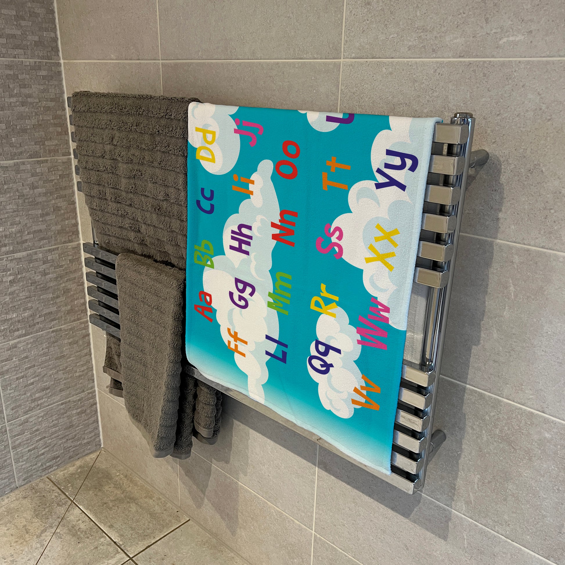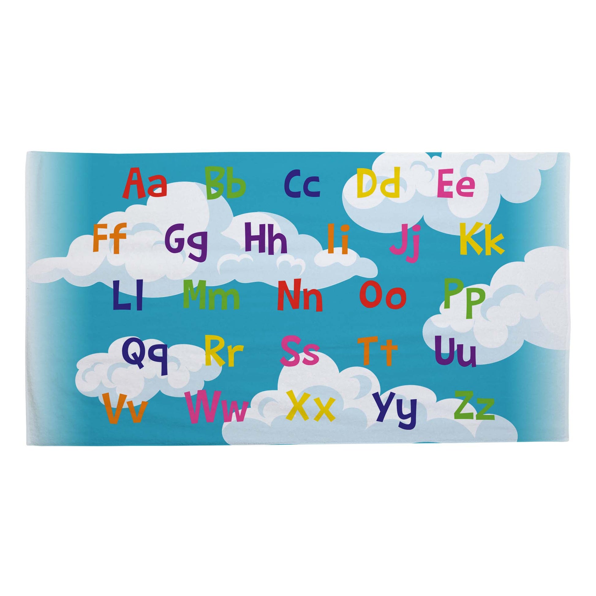 Colourful Cloud Alphabet design. Bright white towel and face flannel pack with a microfibre front and a 100% cotton back. Perfect for bath time and beach days!