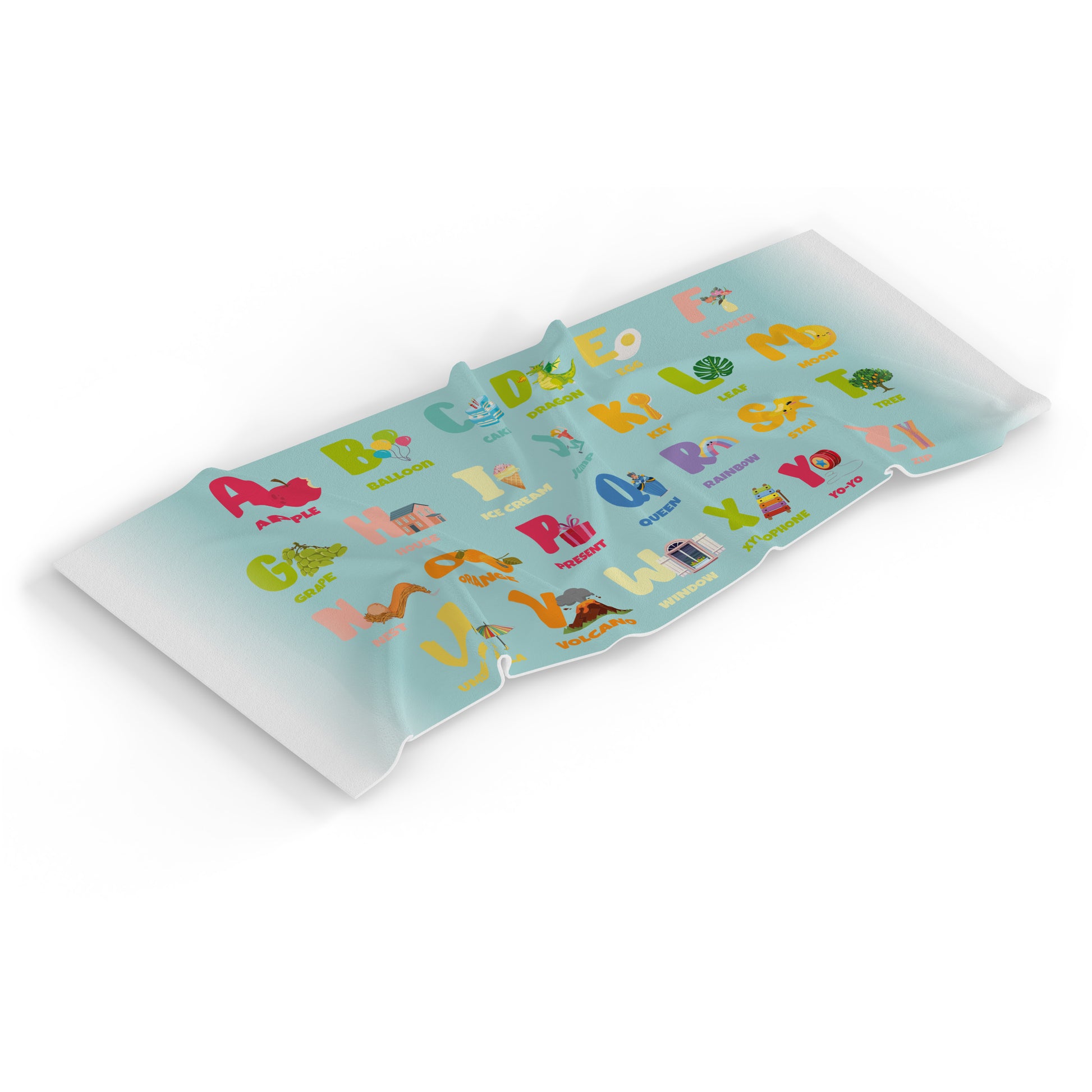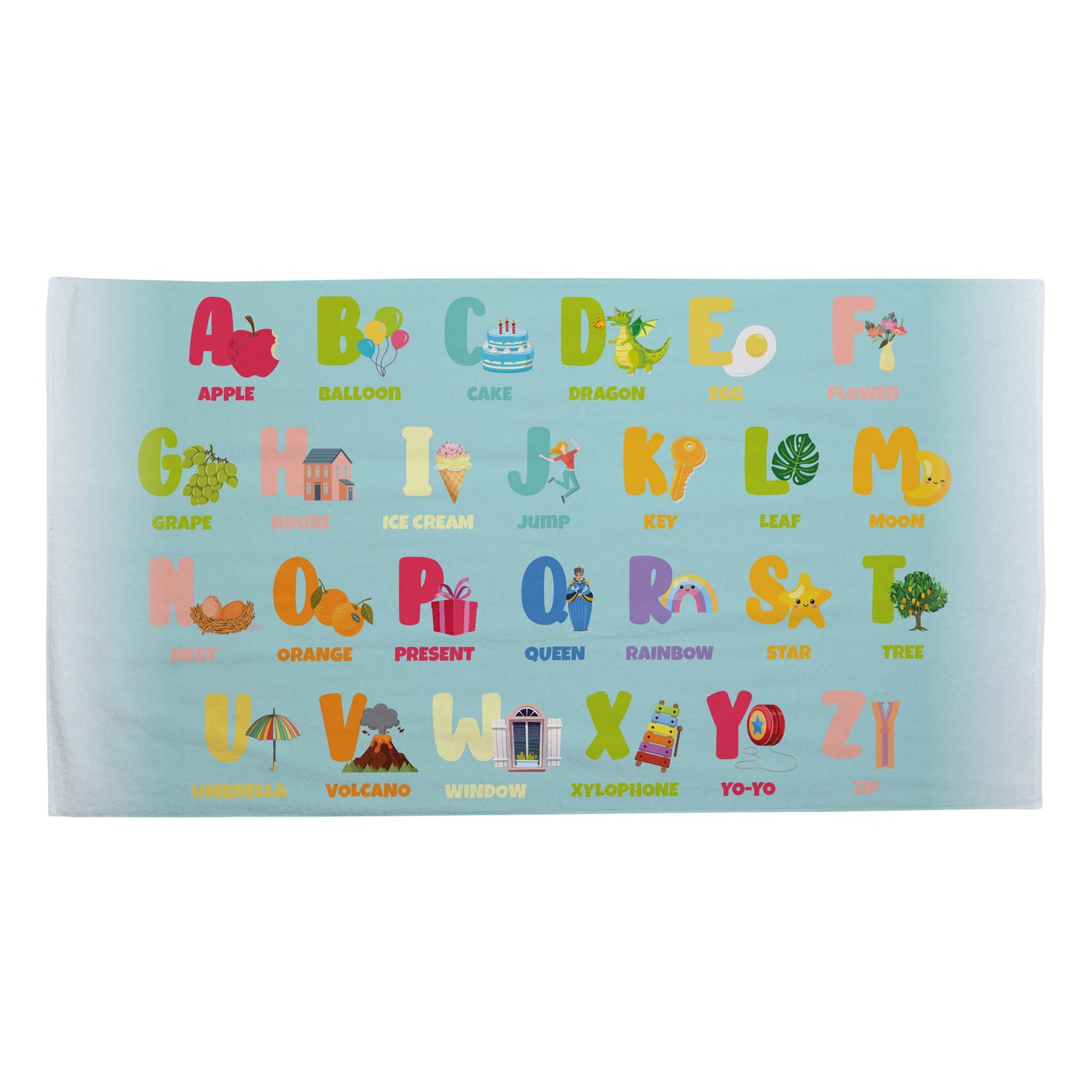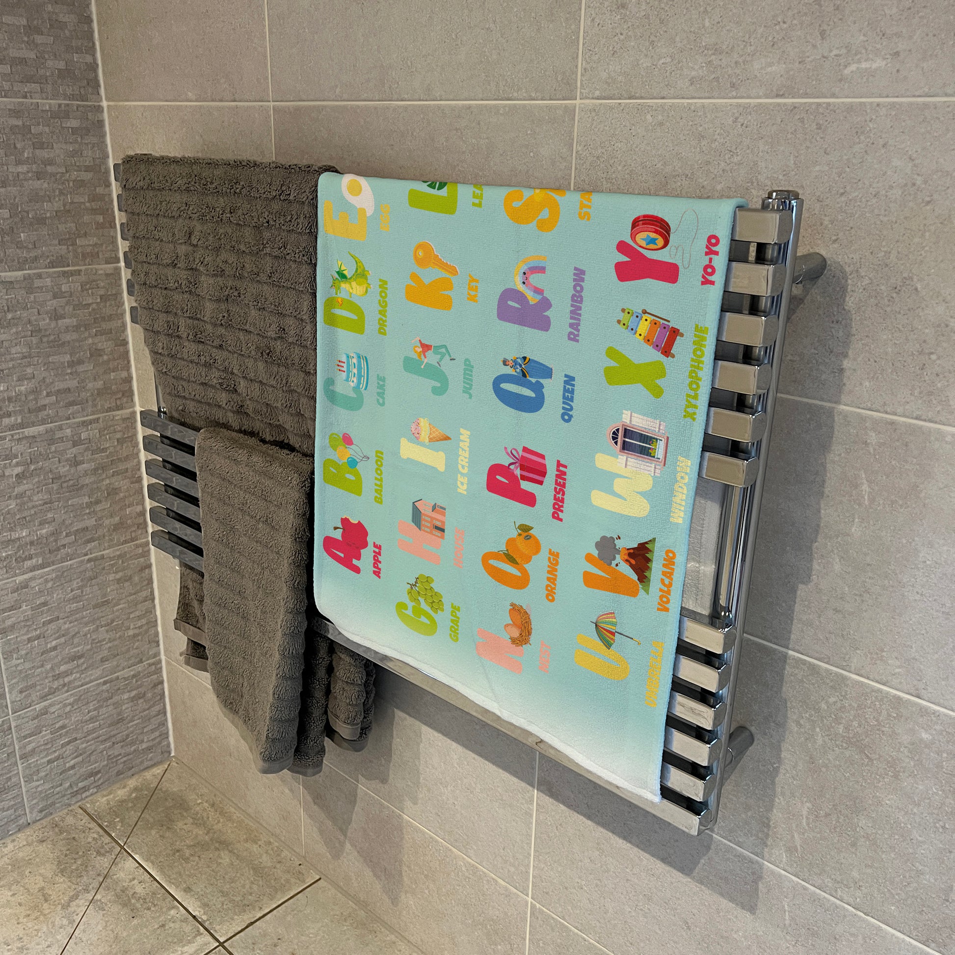 Colourful Object Alphabet design. Bright white towel and face flannel pack with a microfibre front and a 100% cotton back. Perfect for bath time and beach days!