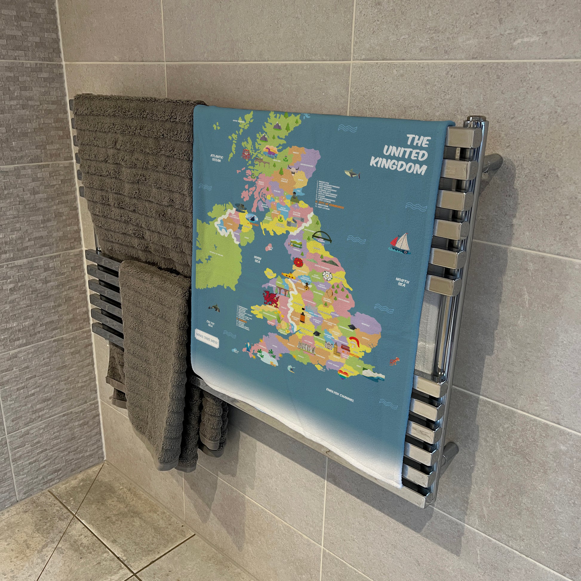 Colourful UK Map design. Bright white towel and face flannel pack with a microfibre front and a 100% cotton back. Perfect for bath time and beach days!