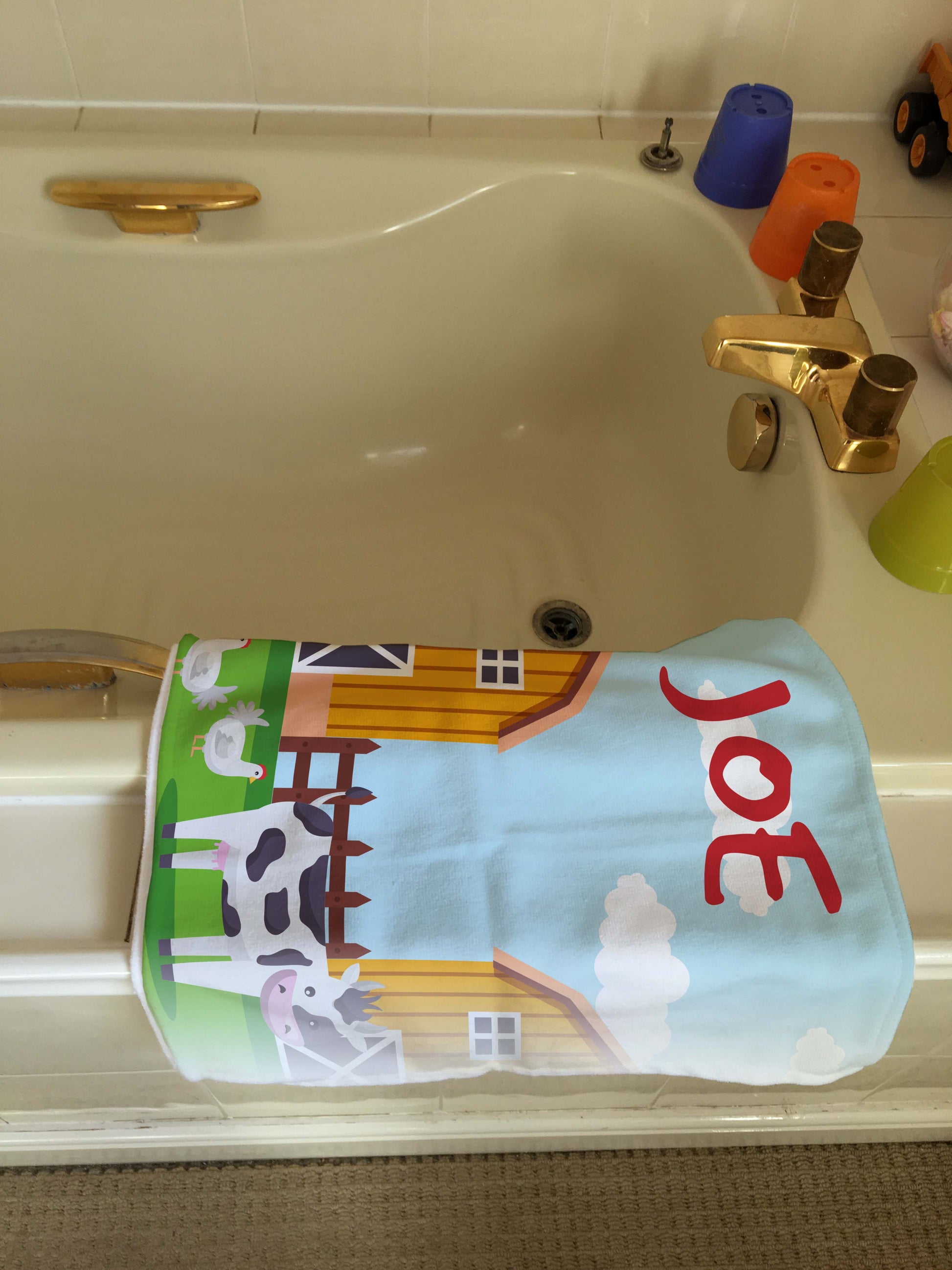 Fantastic colourful farm design. Bright white microfibre towel made from a polyester and cotton mix fabric, it absorbs so much better then most polyester towels sold today! Fantastic for the bathroom, gym or when you're sunning it up on the beach! Towel is printed with your name.