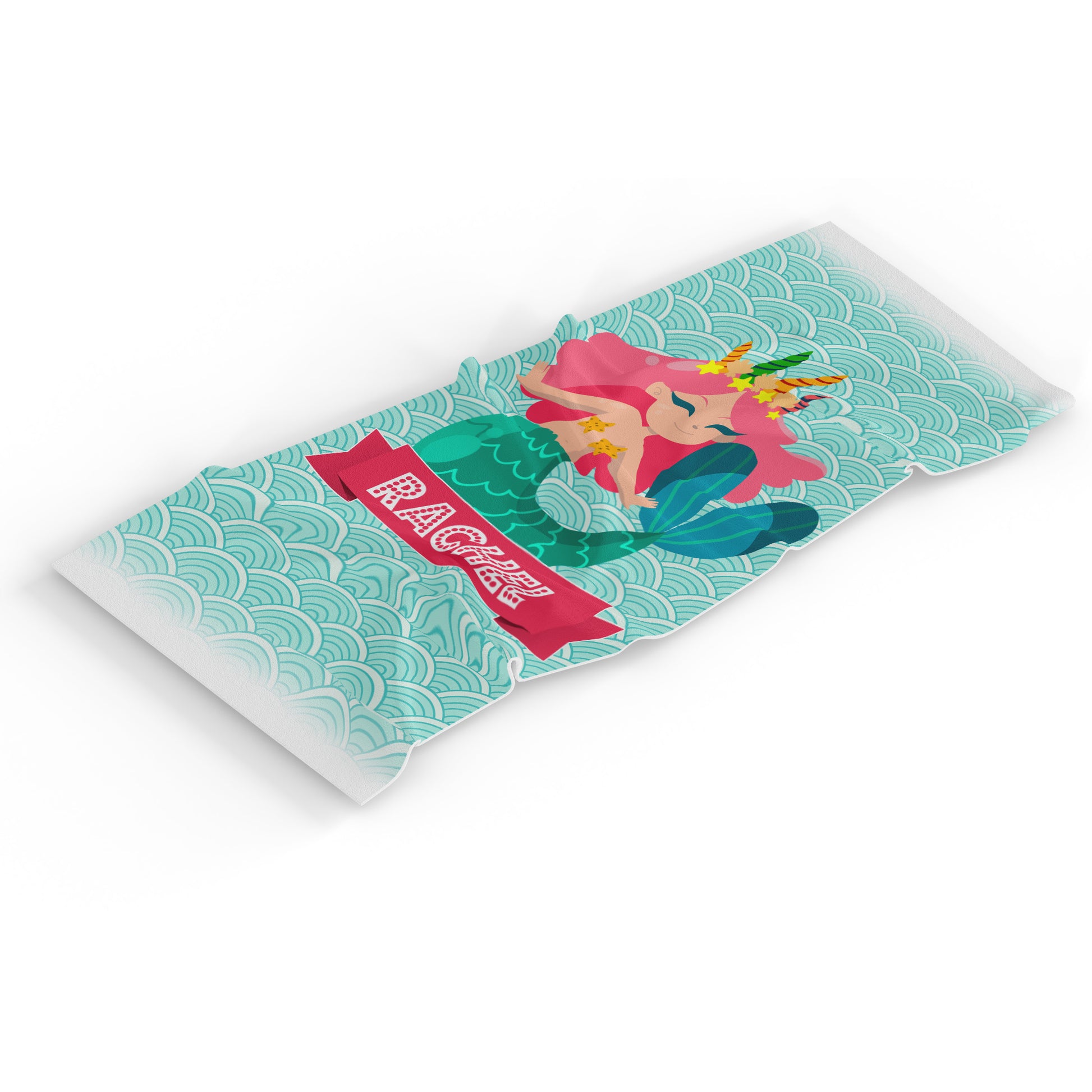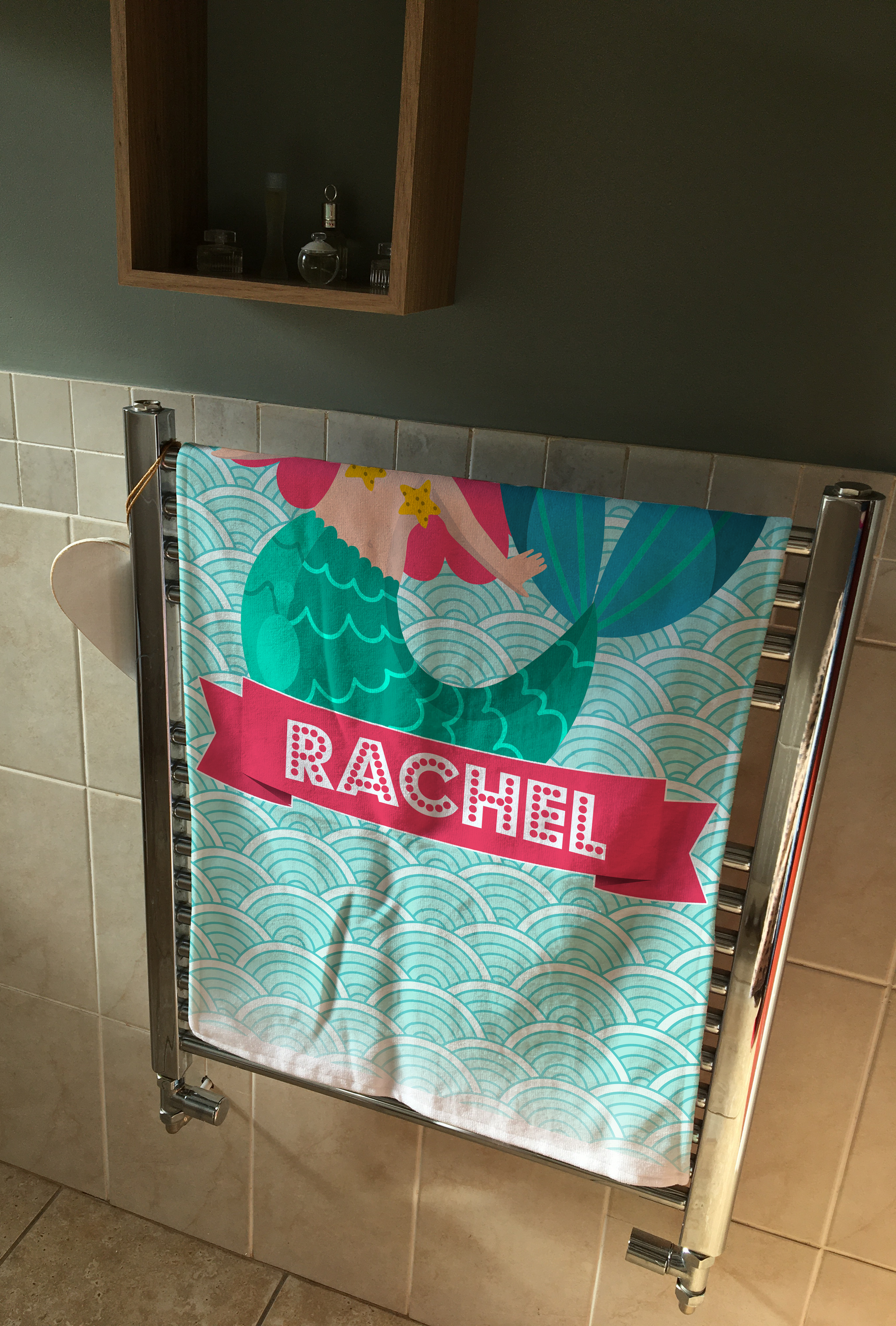 Fantastic colourful mermaid design. Bright white microfibre towel made from a polyester and cotton mix fabric, it absorbs so much better then most polyester towels sold today! Fantastic for the bathroom, gym or when you're sunning it up on the beach! Towel is printed with your name.