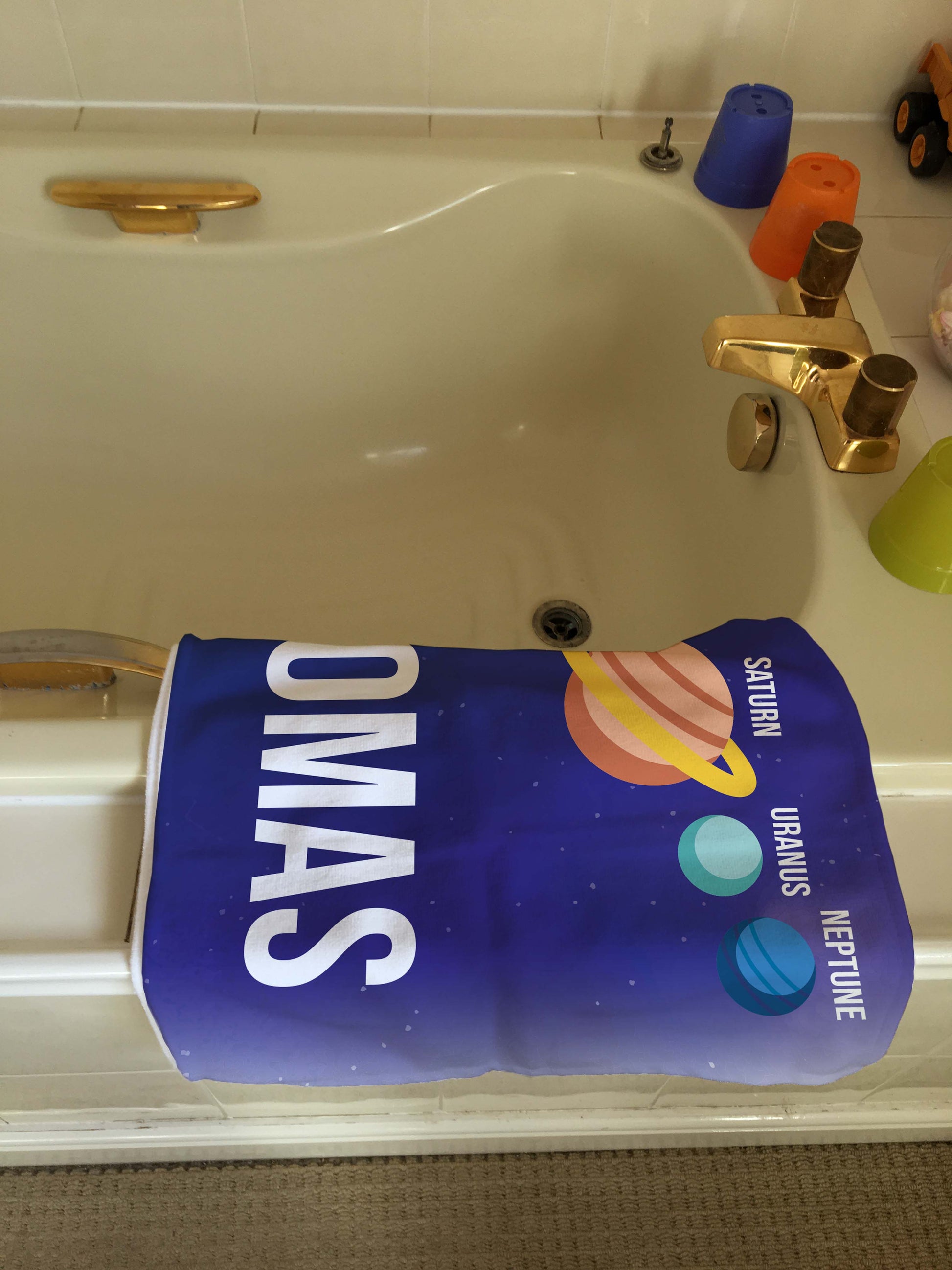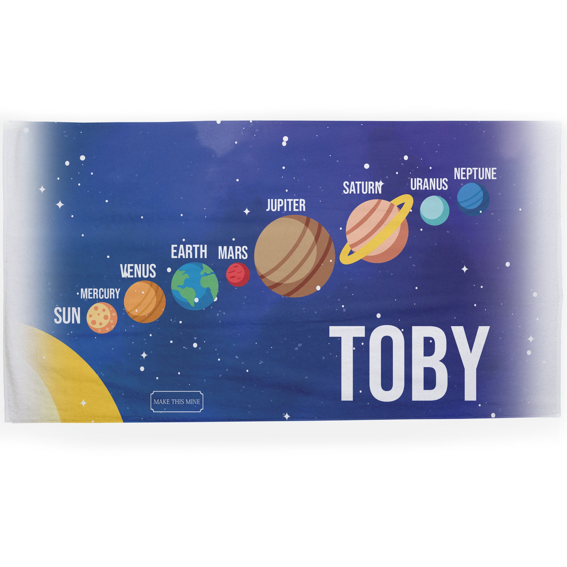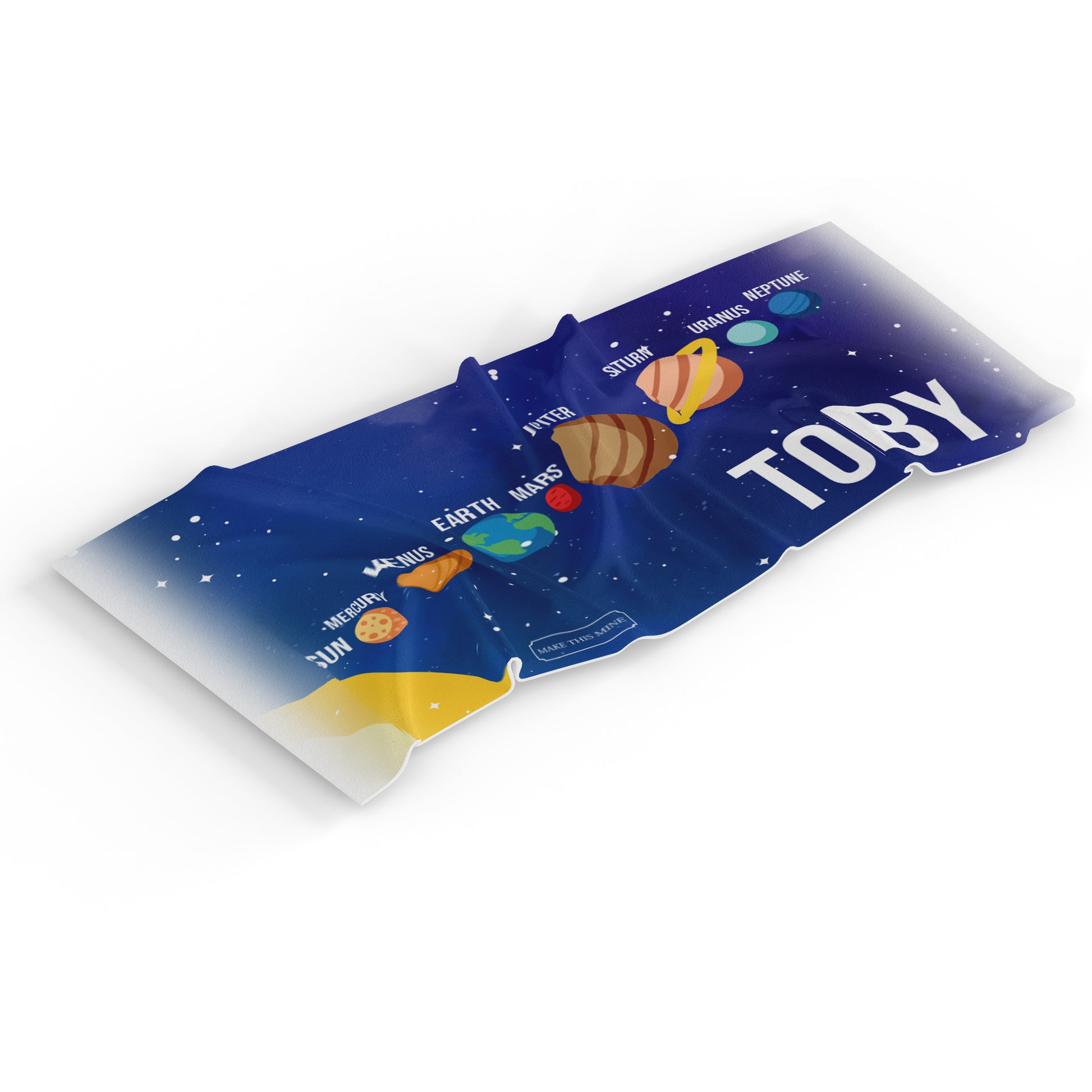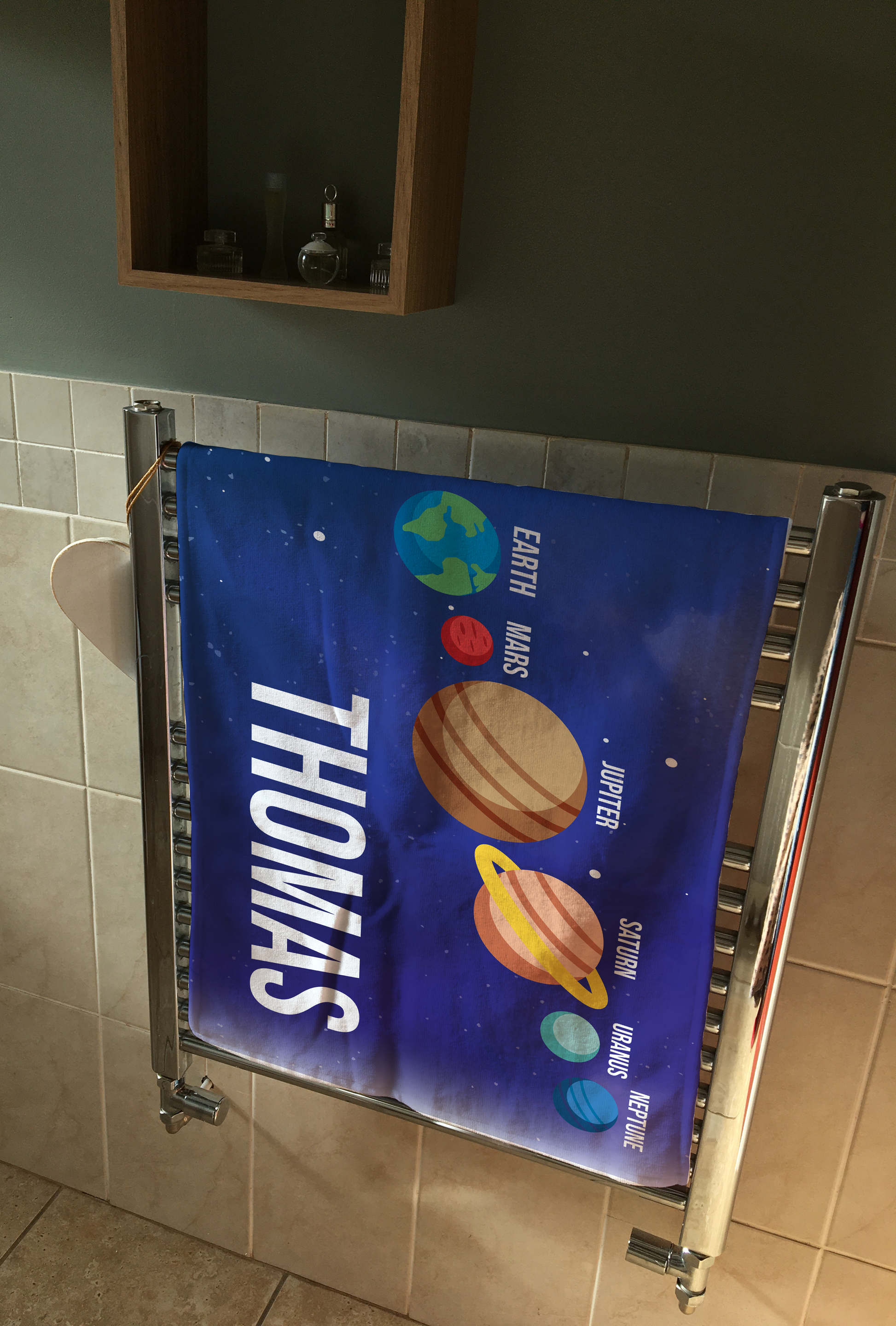 Fantastic colourful planet design. Bright white microfibre towel made from a polyester and cotton mix fabric, it absorbs so much better then most polyester towels sold today! Fantastic for the bathroom, gym or when you're sunning it up on the beach! Towel is printed with your name.