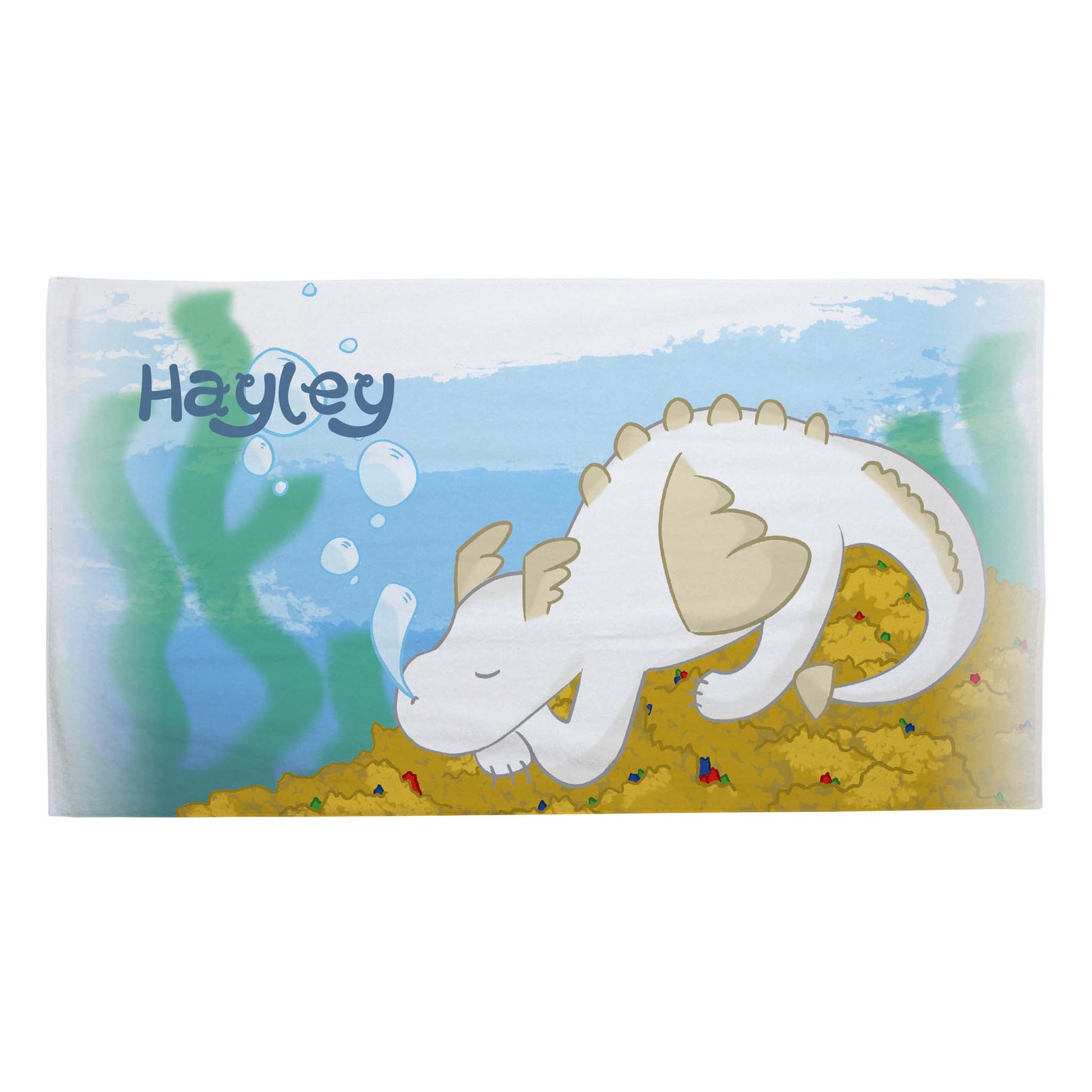 Sea dragon design. Bright white towel with a microfibre front and a 100% cotton back. Perfect for bath time and beach days!