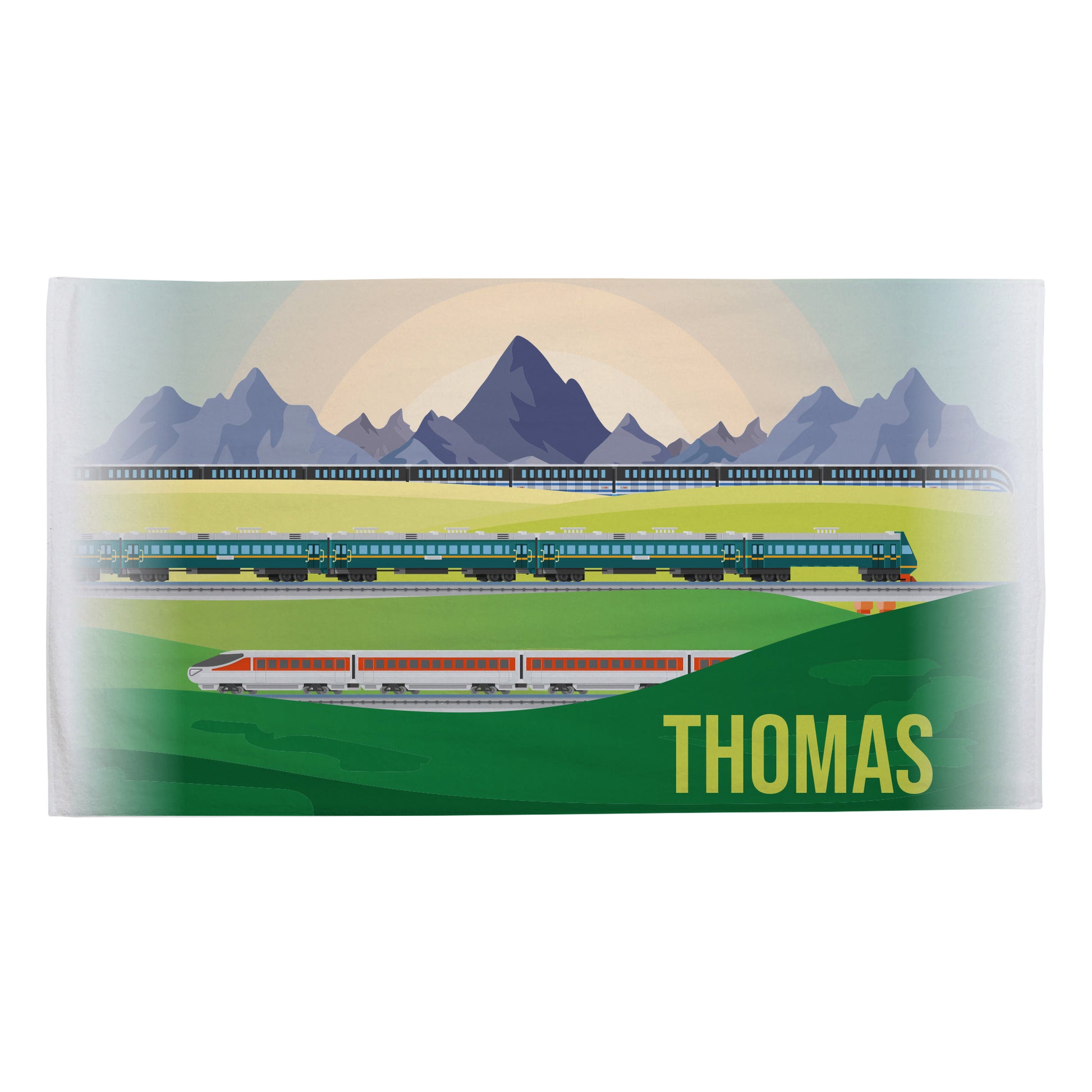 Train design. Bright white towel with a microfibre front and a 100% cotton back. Perfect for bath time and beach days!