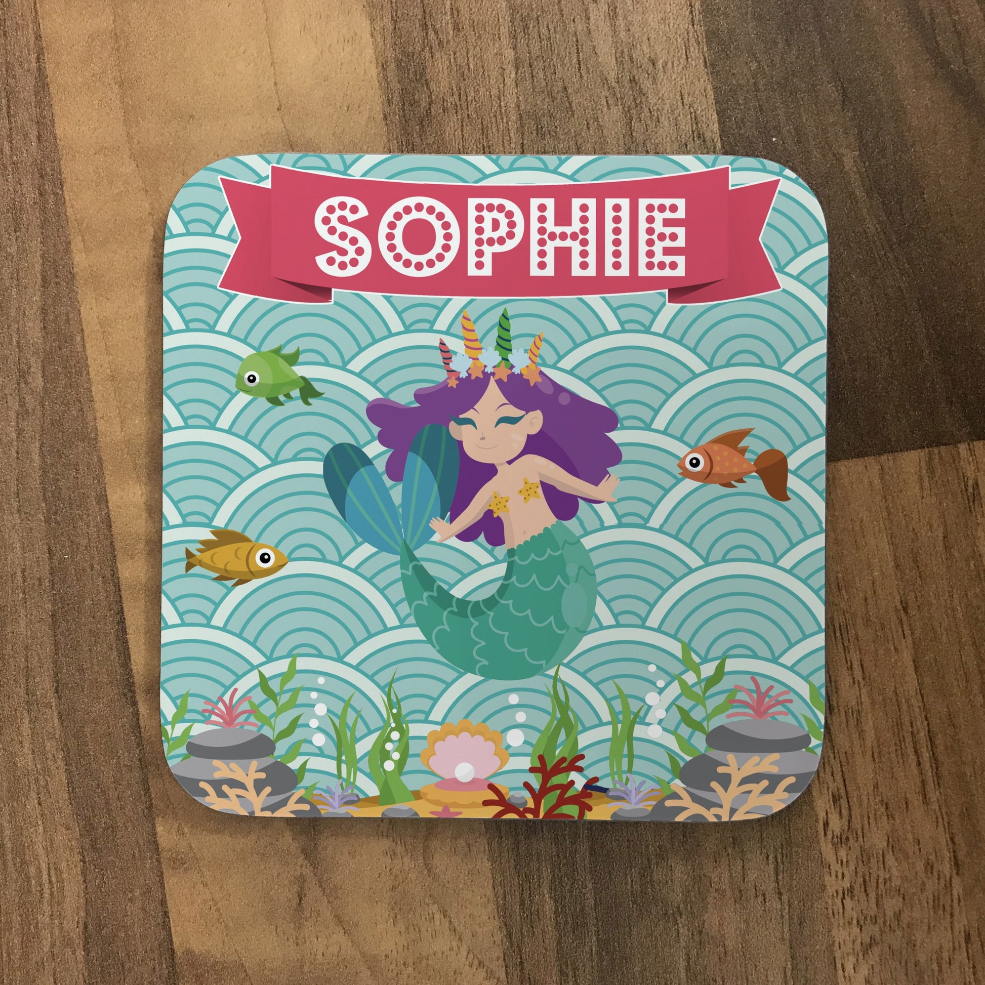 Personalised Kids Hardboard Placemat and Coaster Set Mermaid Design
