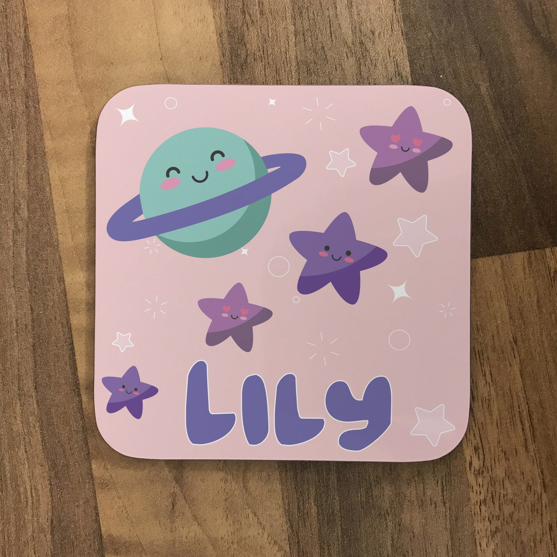 Personalised Kids Hardboard Placemat and Coaster Set Pink Space Design
