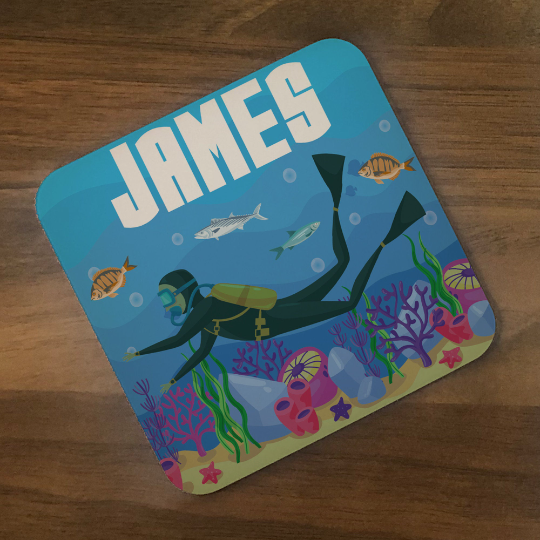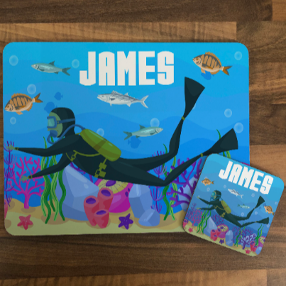 Personalised Kids Hardboard Placemat and Coaster Set Scuba Design