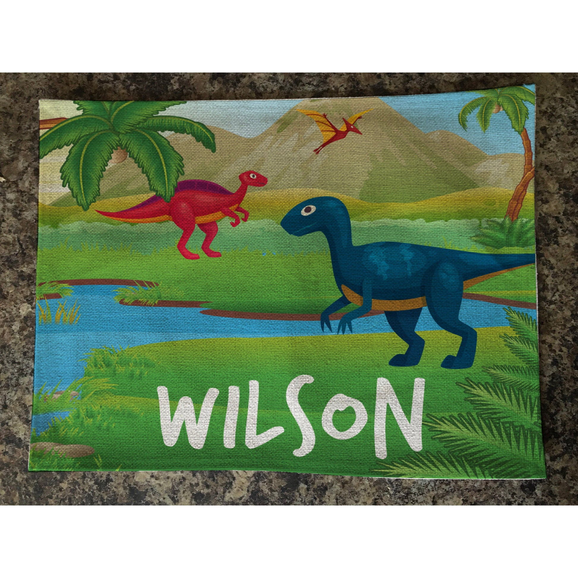 Personalised Kids Linen Placemat Dinosaur Landscape