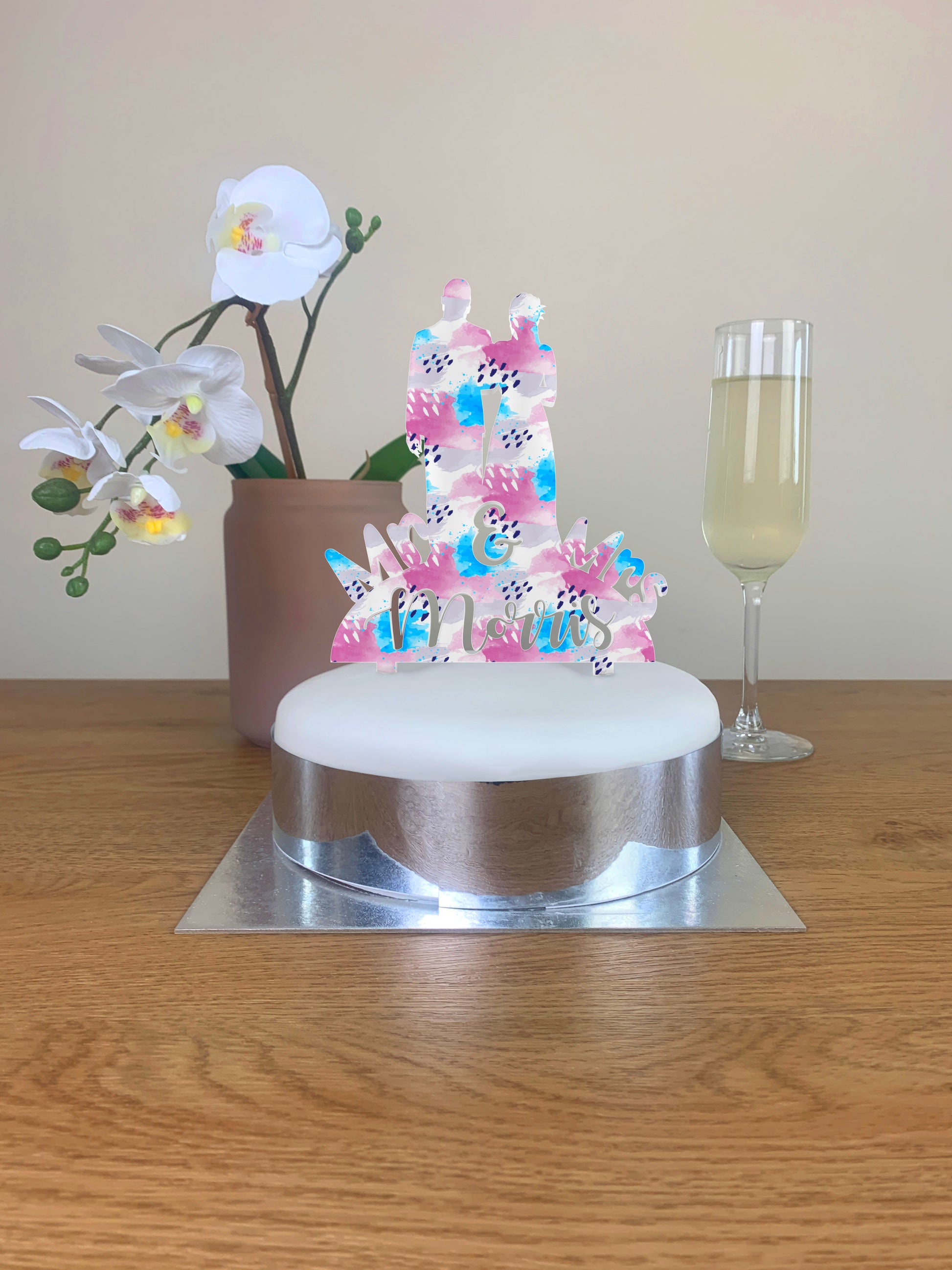 Personalised perspex wedding cake topper printed with a colour pattern of your choosing.