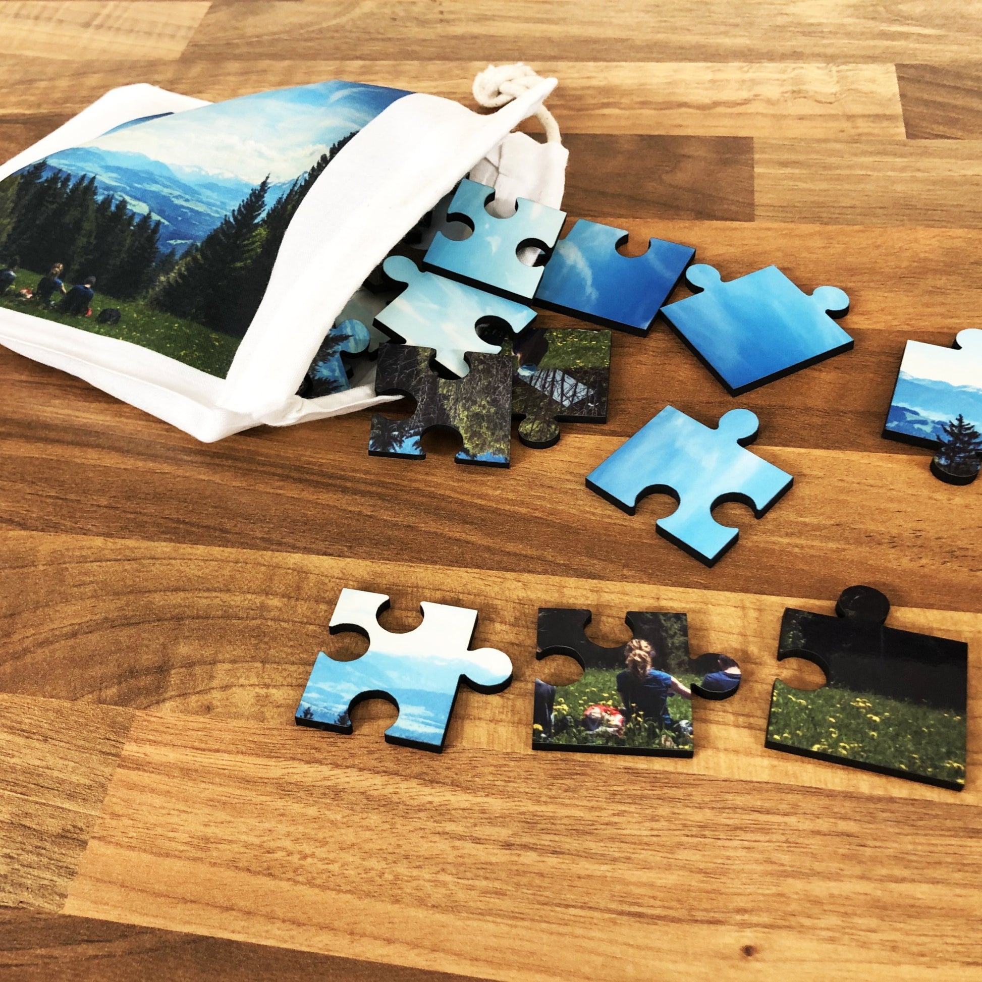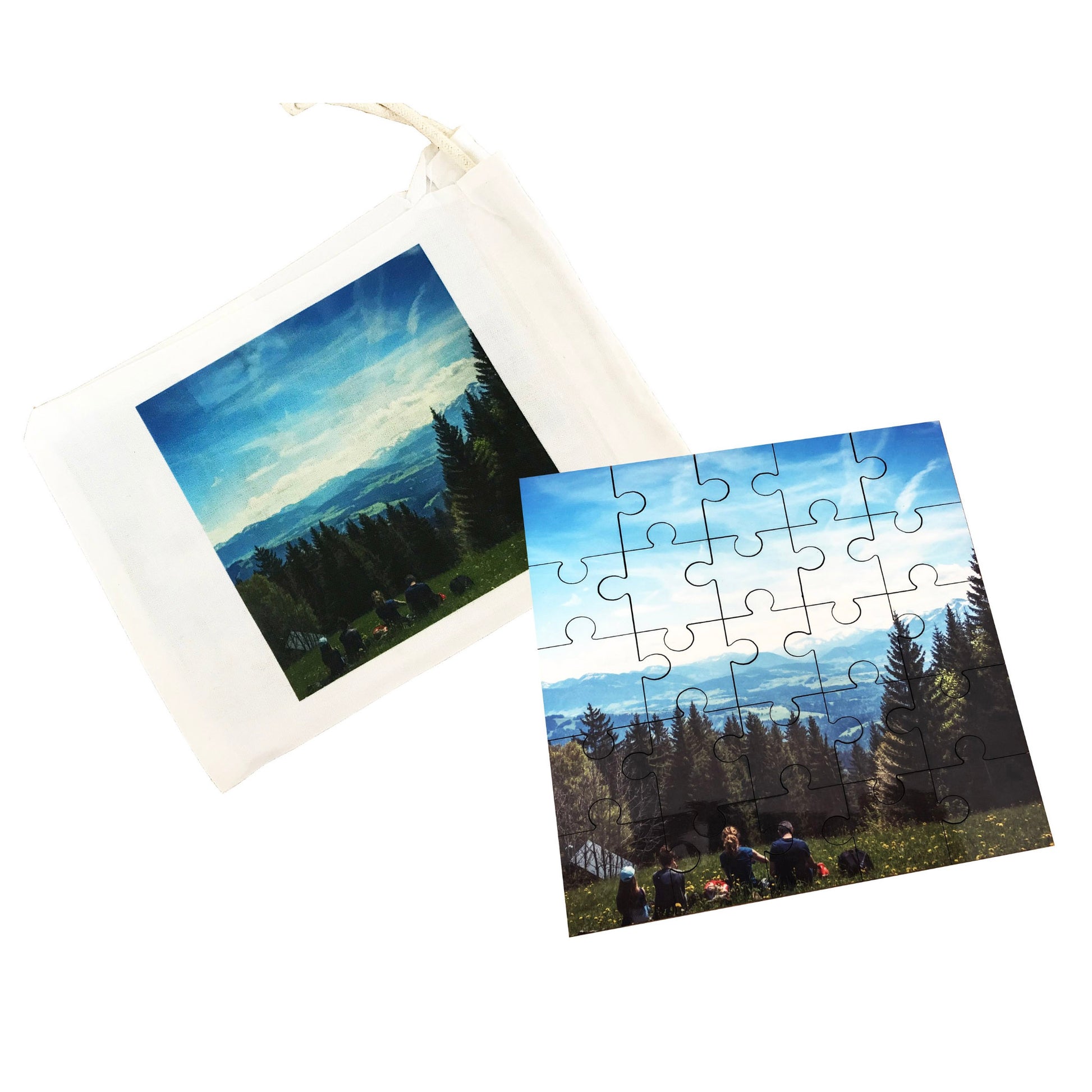 MDF 25pcs Square Jigsaw Puzzle with Storage Gift Bag, both with your photo printed on.