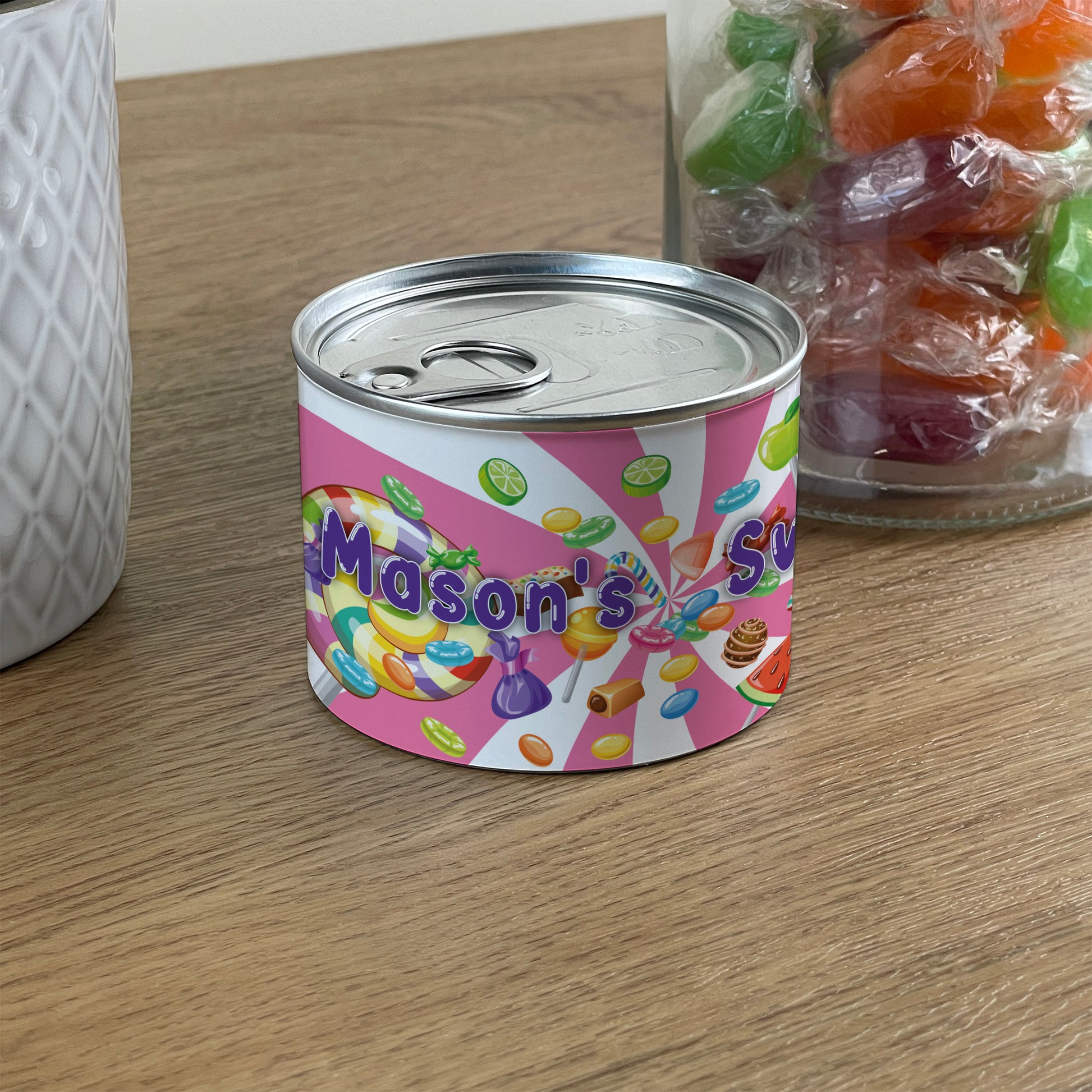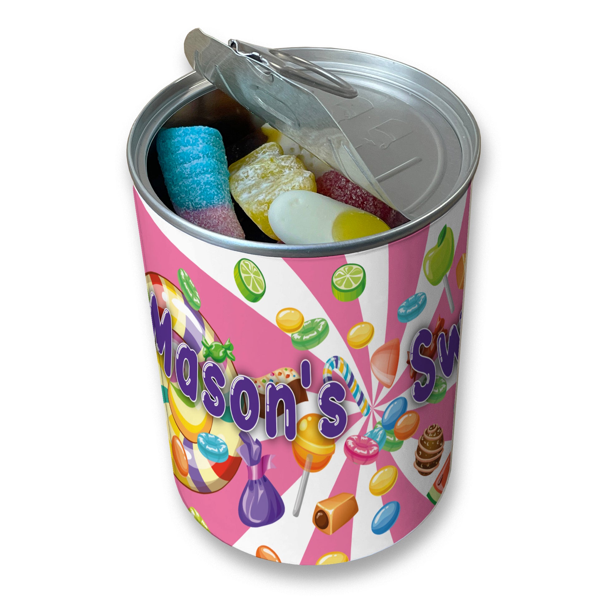 Personalised Pick & Mix Sweets Tin Can with Lollipop Swirl Design
