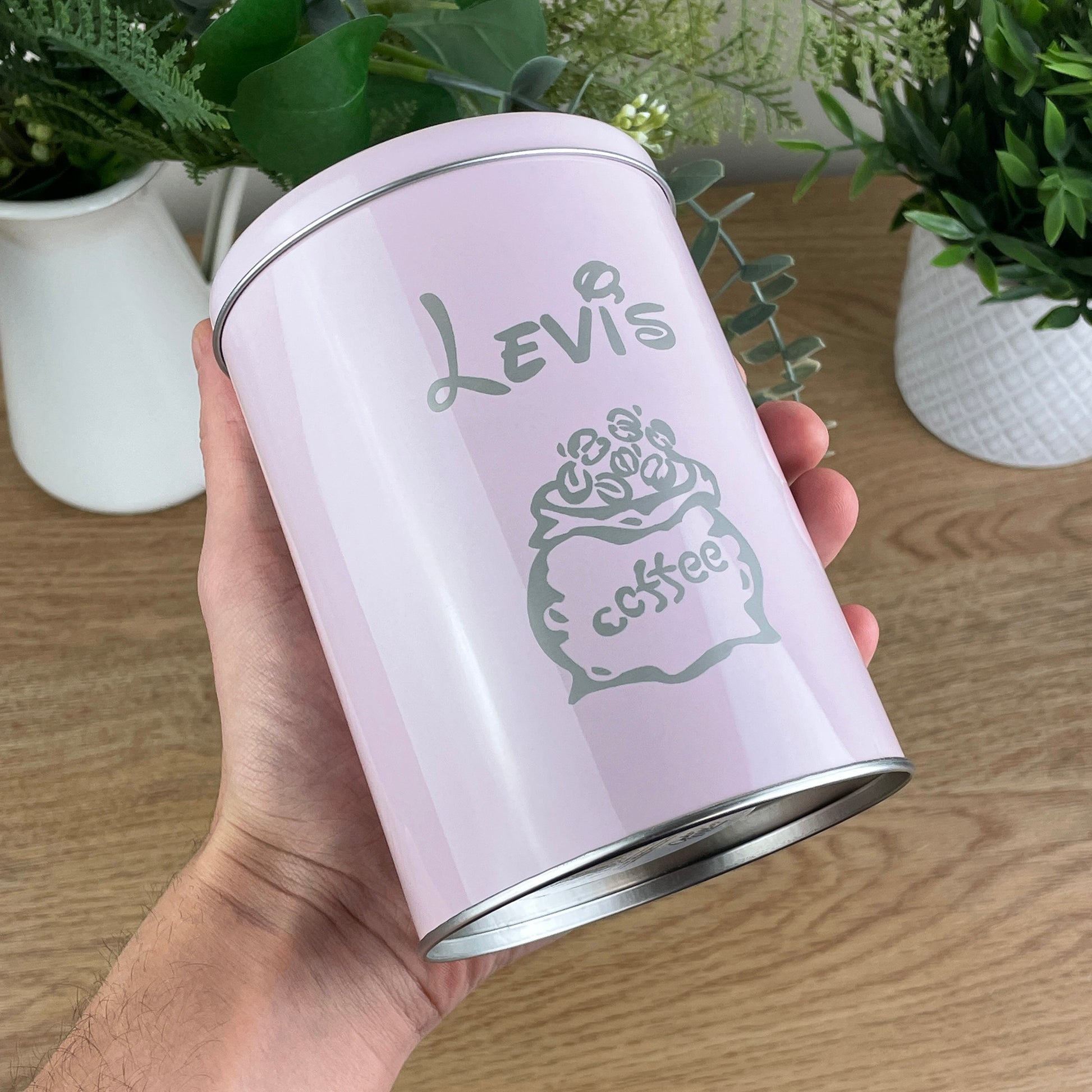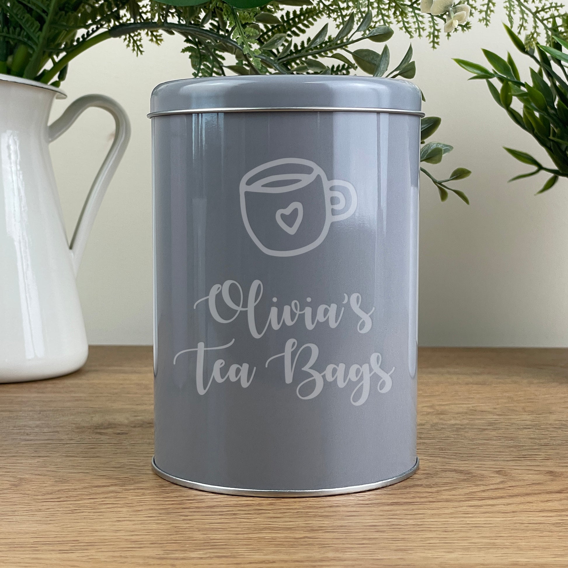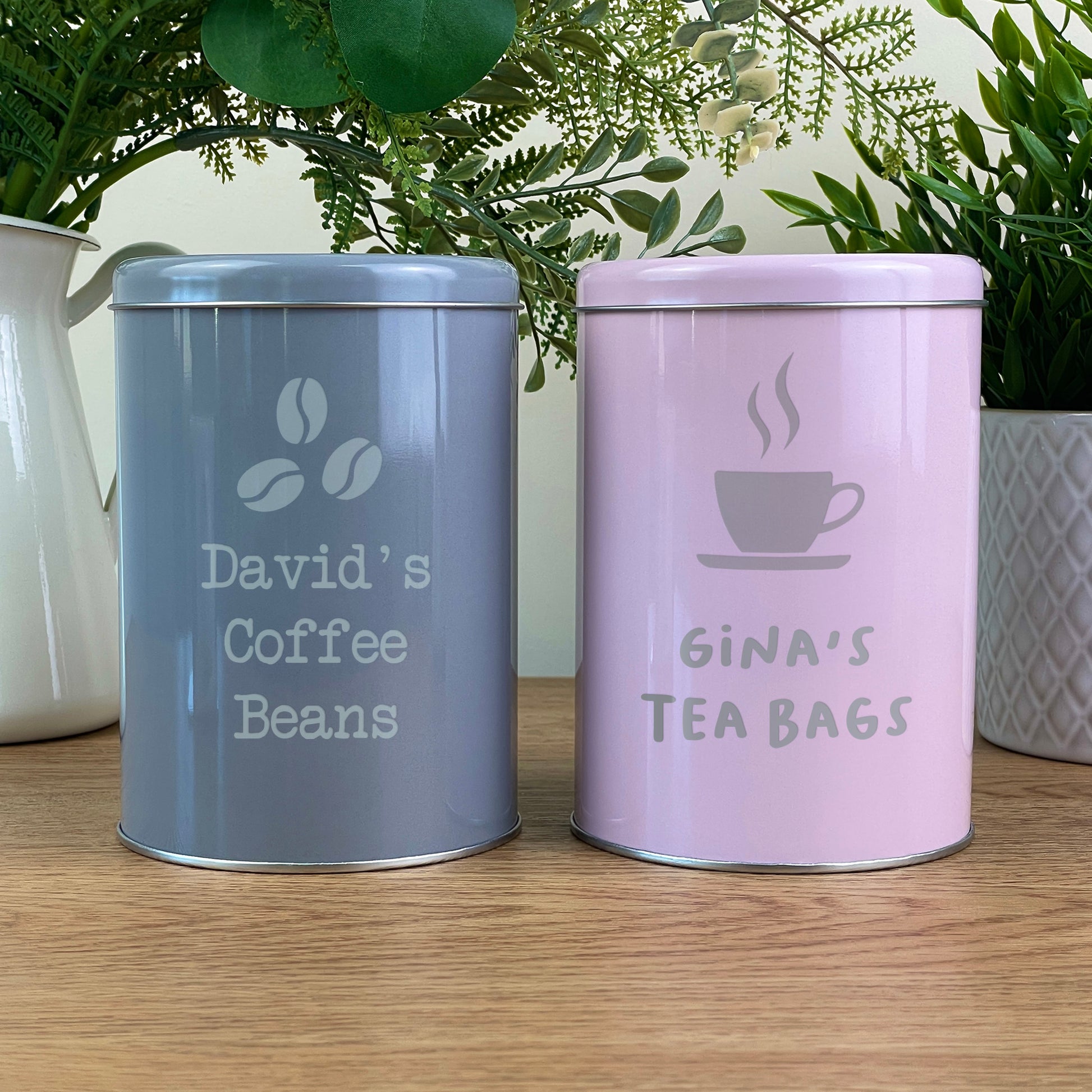 Keep your stash of tea bags, loose tea, coffee beans or coffee grounds in a personalised round metal storage tin engraved just to your liking.