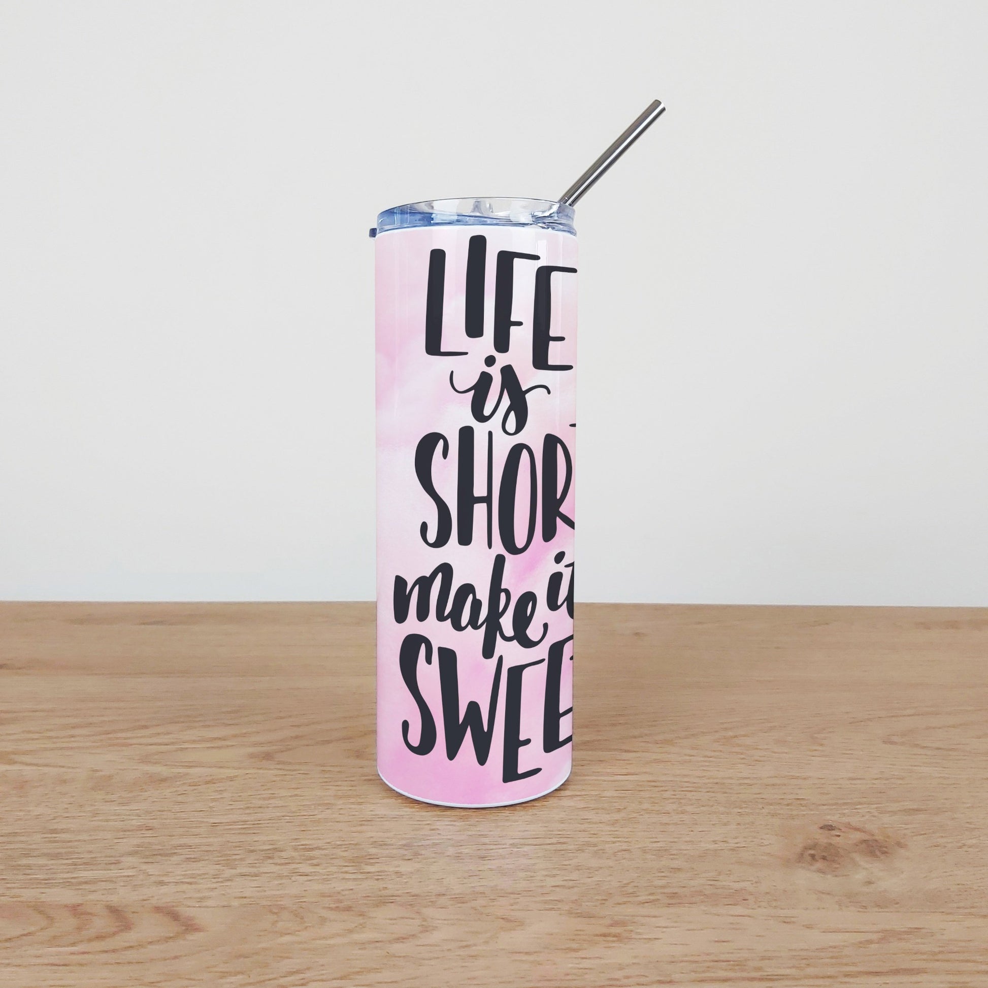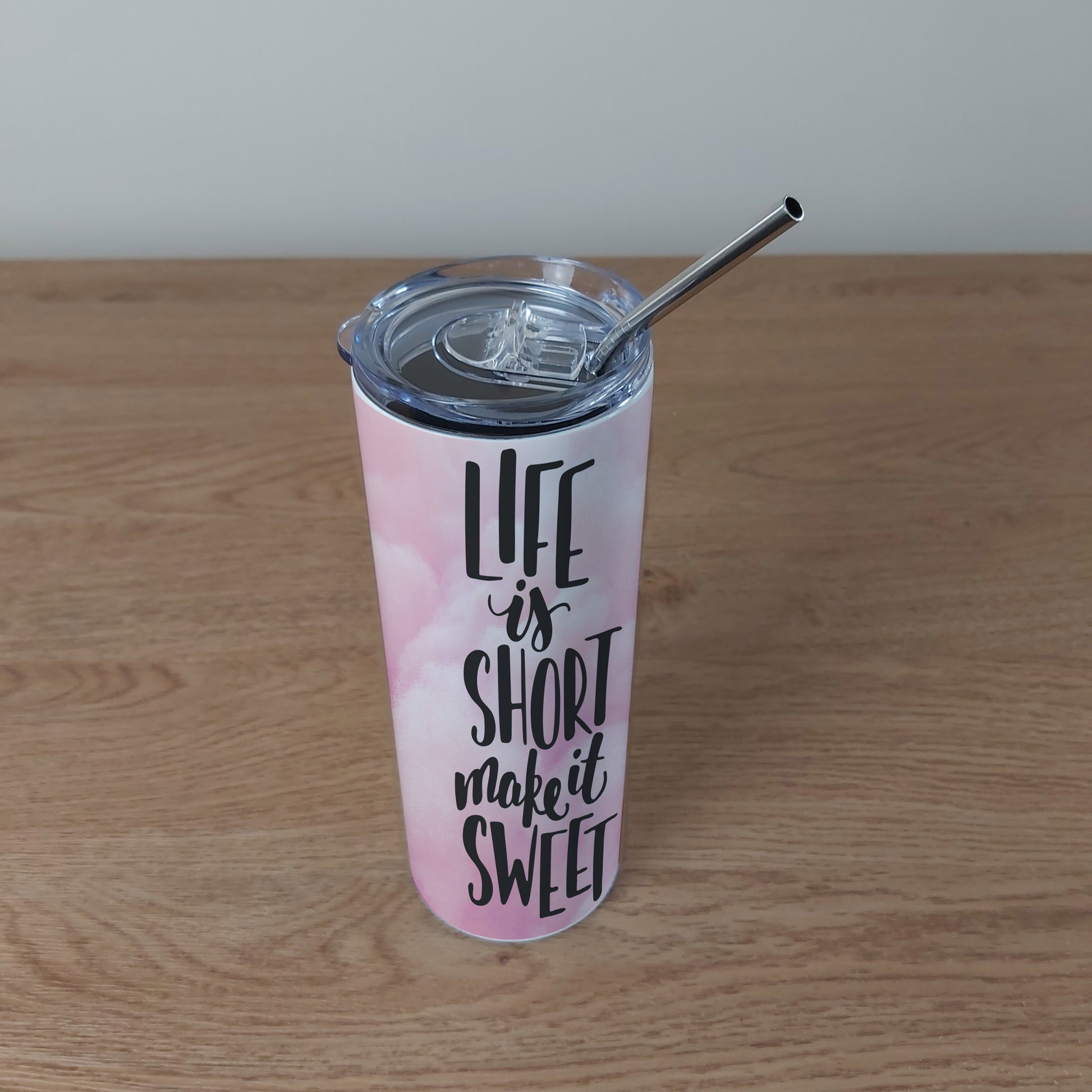 Life is short make it sweet design on a stainless steel tumbler, comes with eco-friendly stainless steel straw.