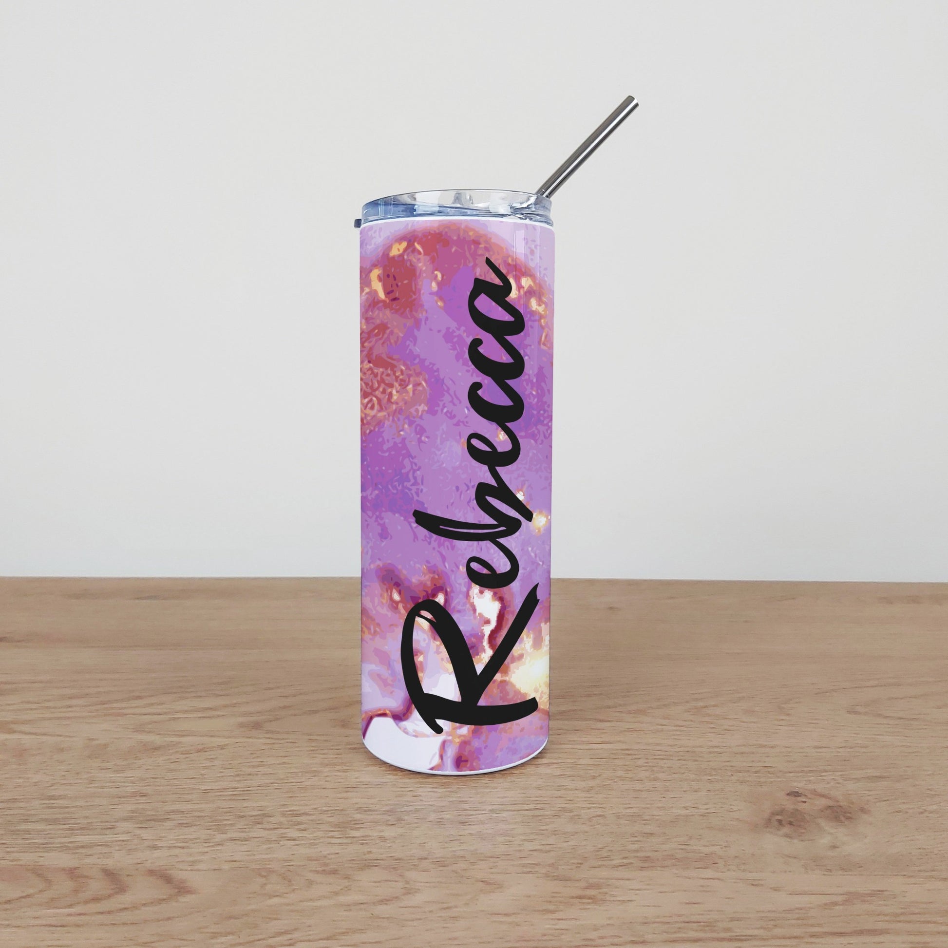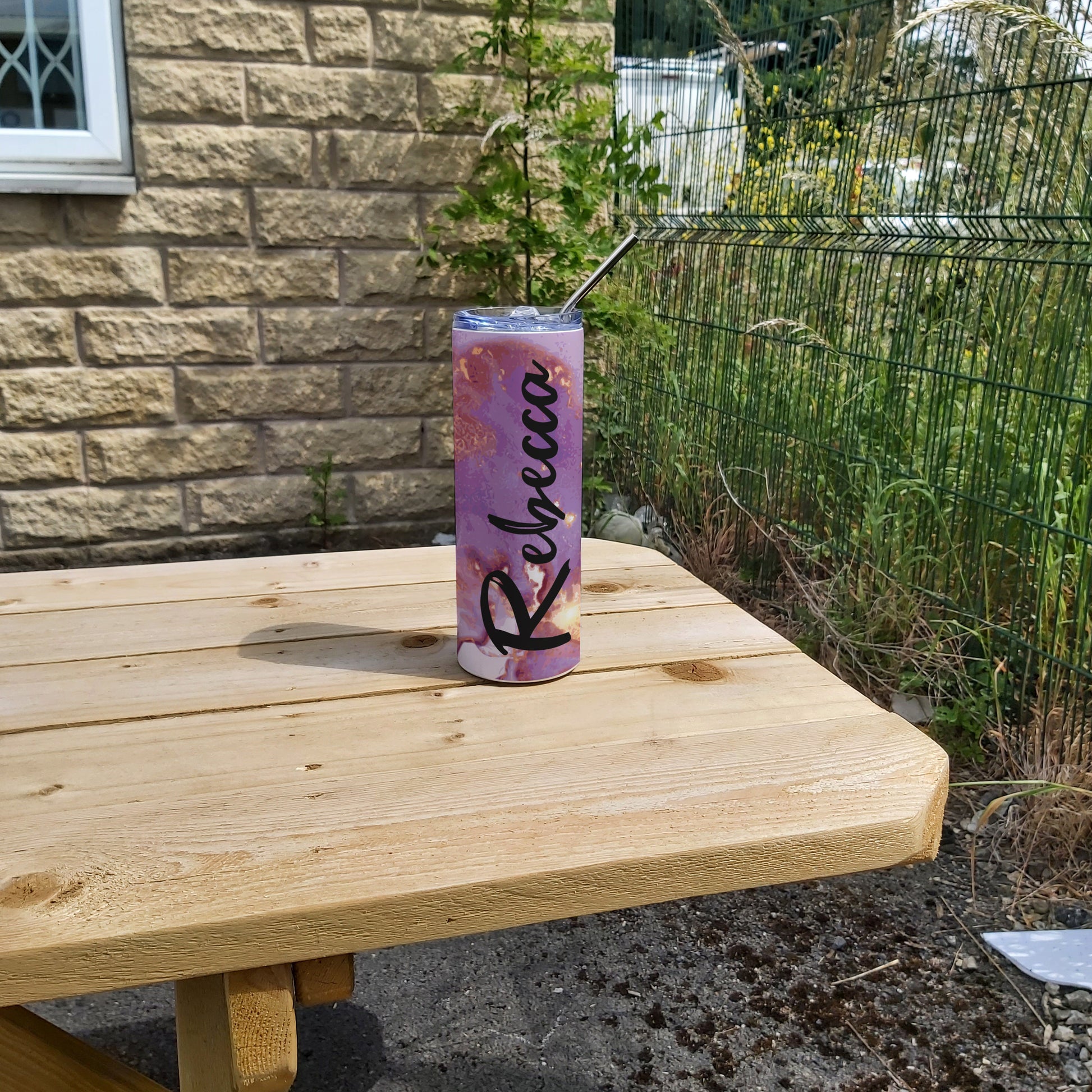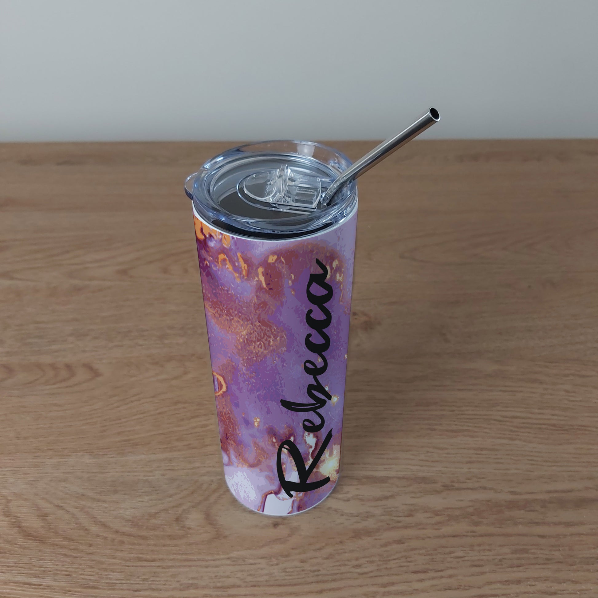 Personalised Stainless Steel Skinny Tumbler & Straw with Purple Marble Design
