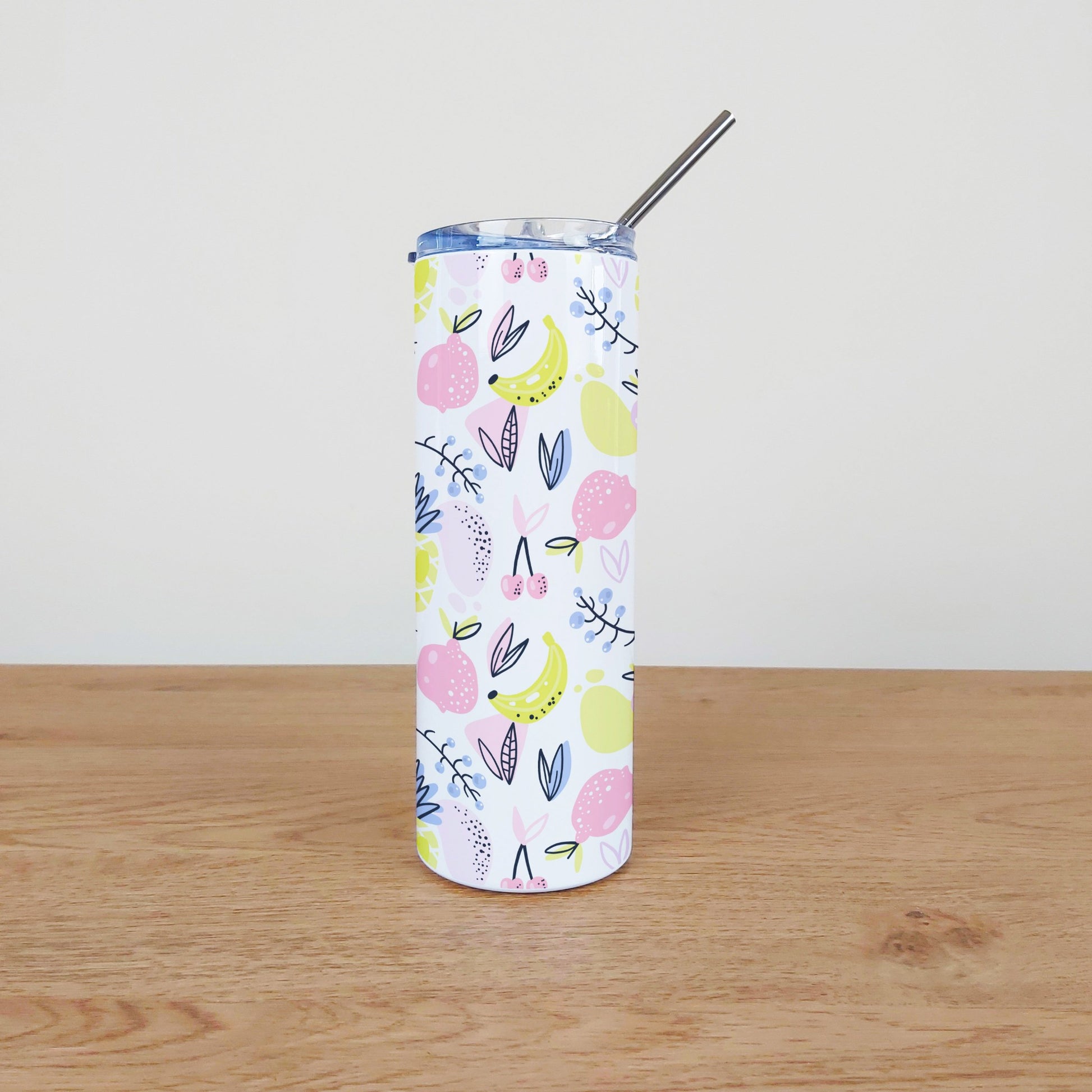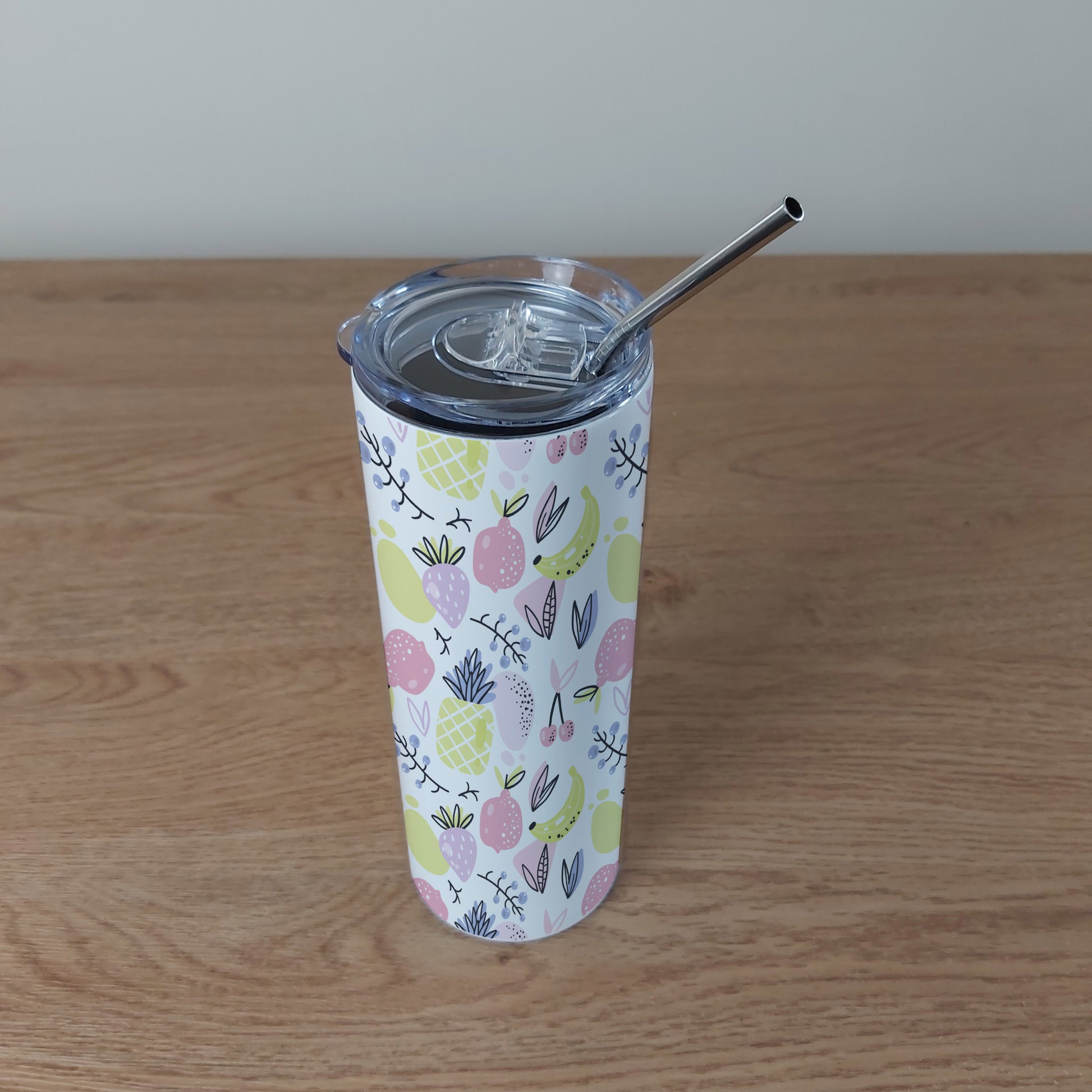 Stainless Steel Skinny Tumbler & Straw with Colourful Fruit Pattern Design