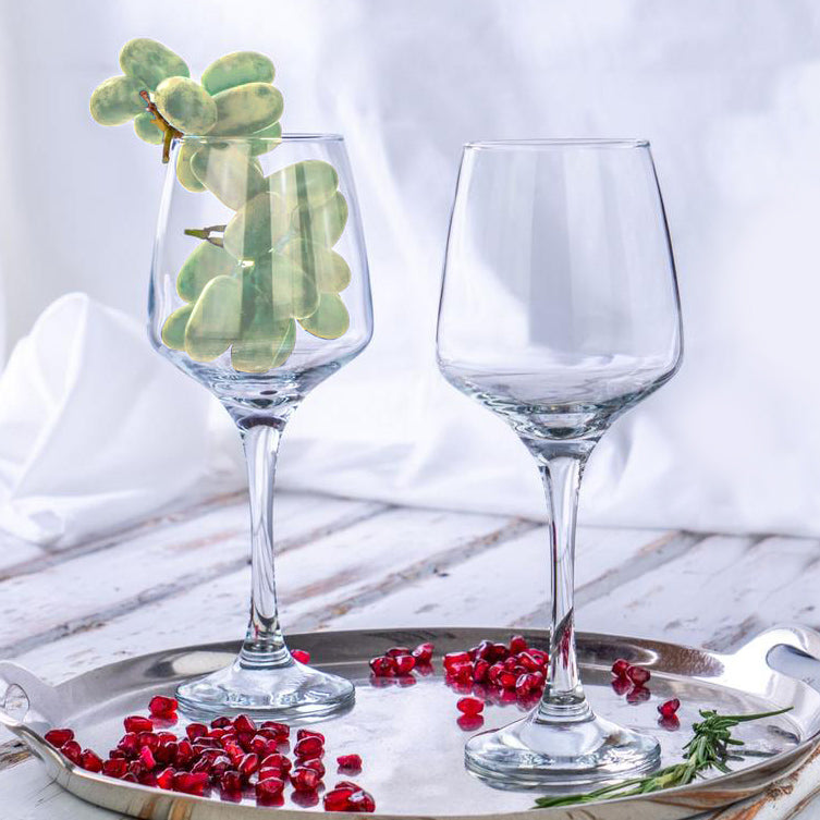 The glass has an elongated bowl which keeps the wine cool and makes the aromas more distinct, enhancing your experience of the drink.